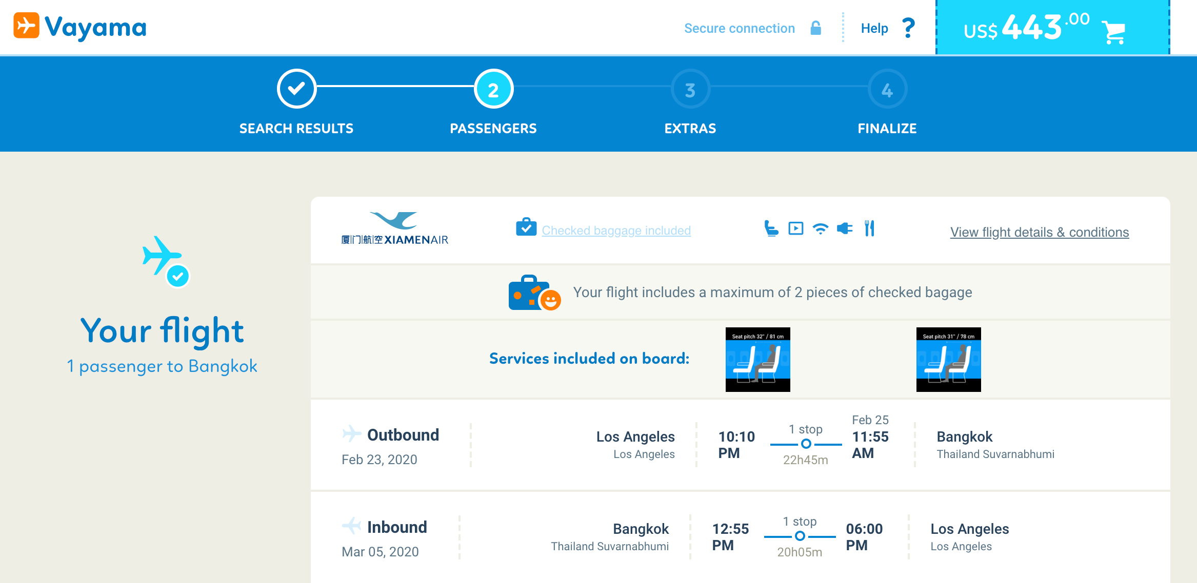 Los Angeles (LAX) to Bangkok (BKK) for $443 round trip on Xiamen Air via Vayama: