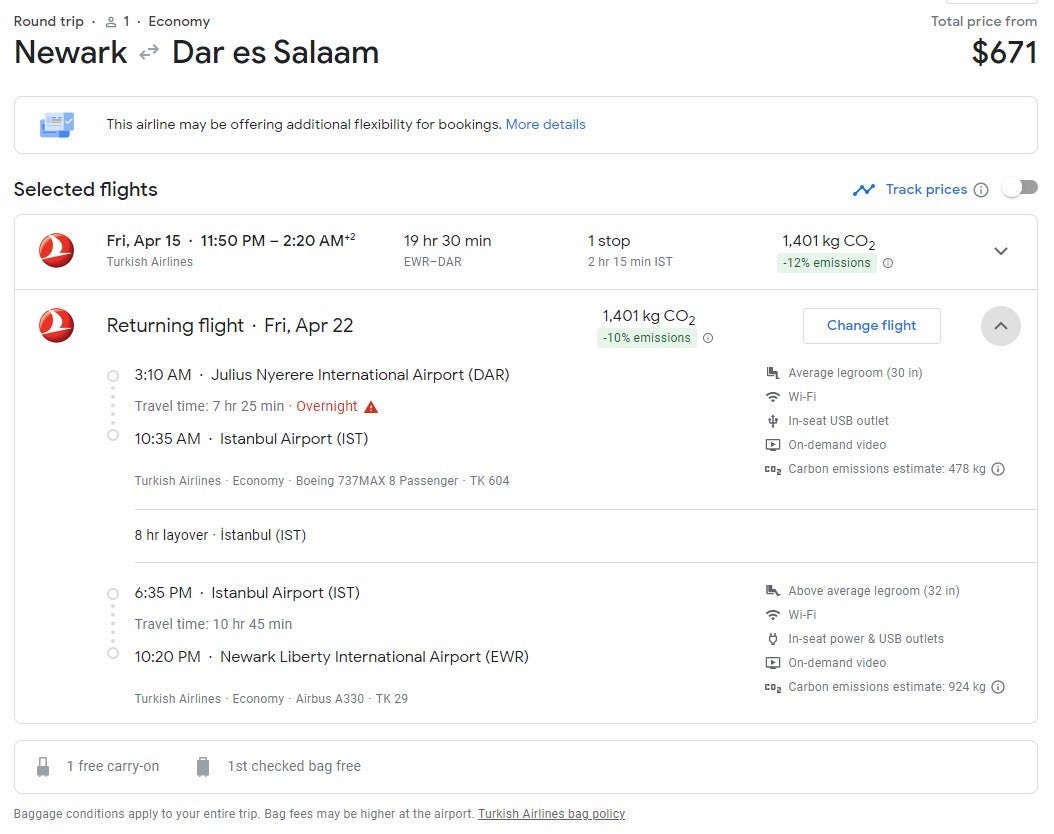 For the same price, travelers can go from Newark (EWR) to Dar es Salaam (DAR) for $671 round trip. The deal includes a stop in Istanbul (IST) each way, including an eight-hour layover on the return flight.