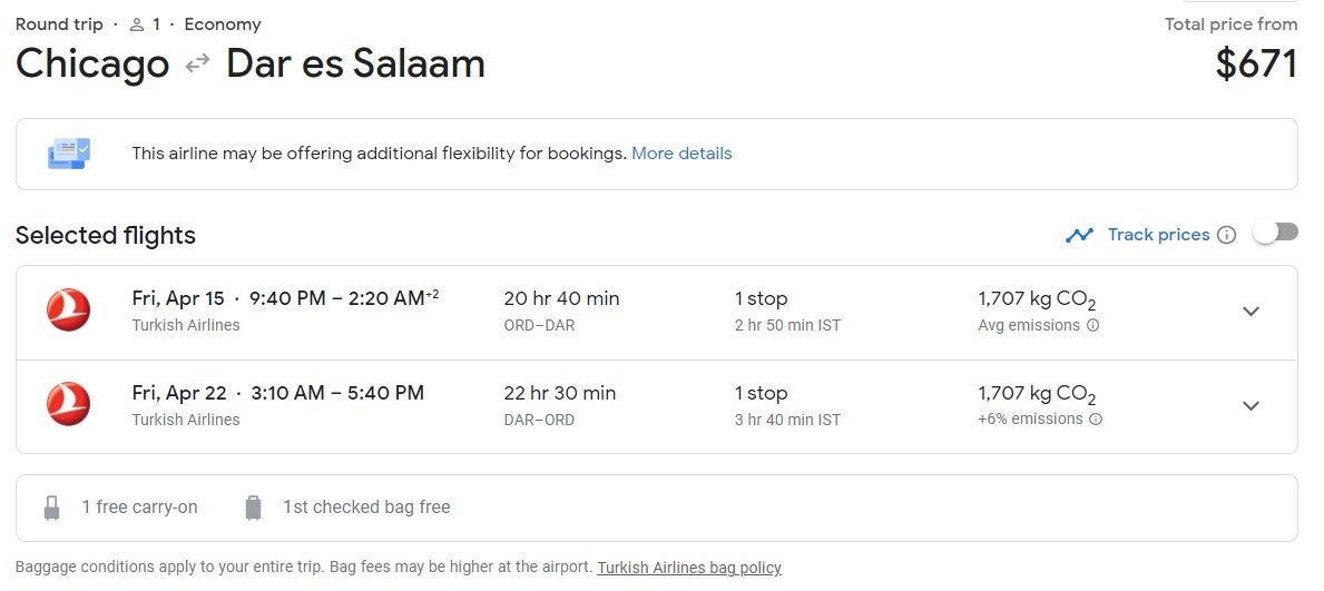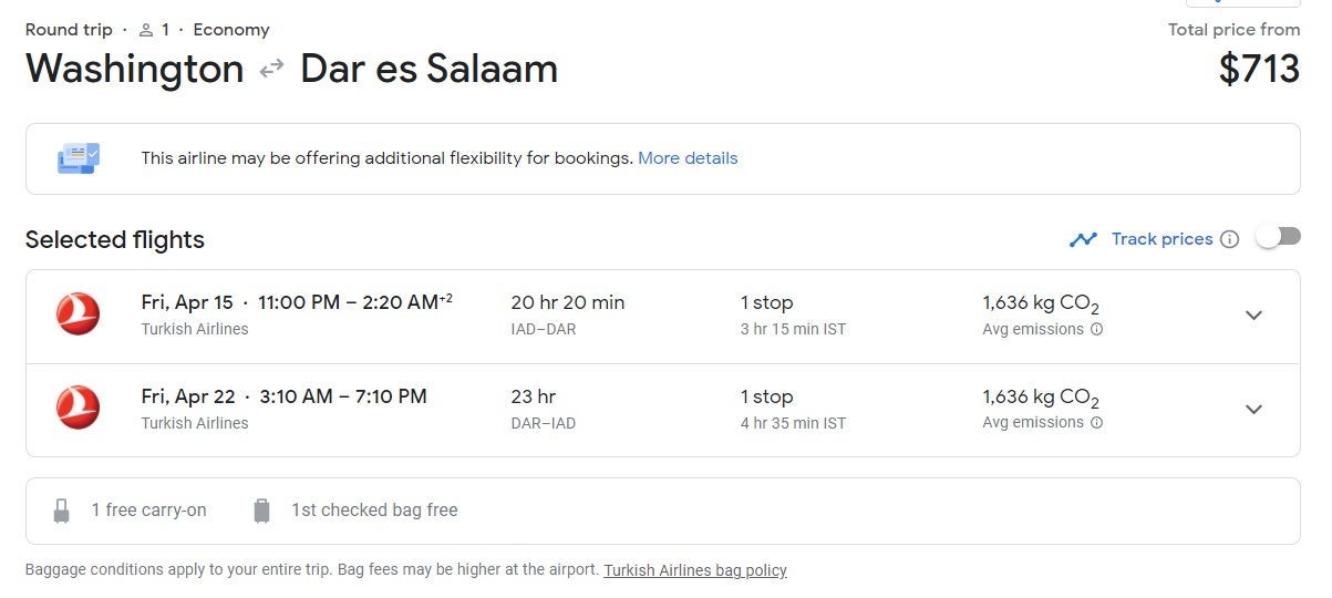 Travel options from Washington, D.C. (IAD) to Dar es Salaam (DAR) are available at $713 round trip if booked in mid-April, as seen in the deal below.