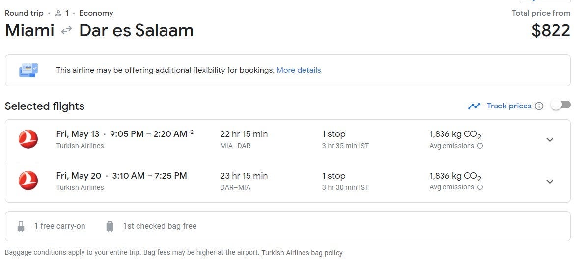 Flights from Miami (MIA) to Dar es Salaam (DAR) start at $822 round trip in May. According to Google Flights, this price is over $250 cheaper than usual for the dates below.