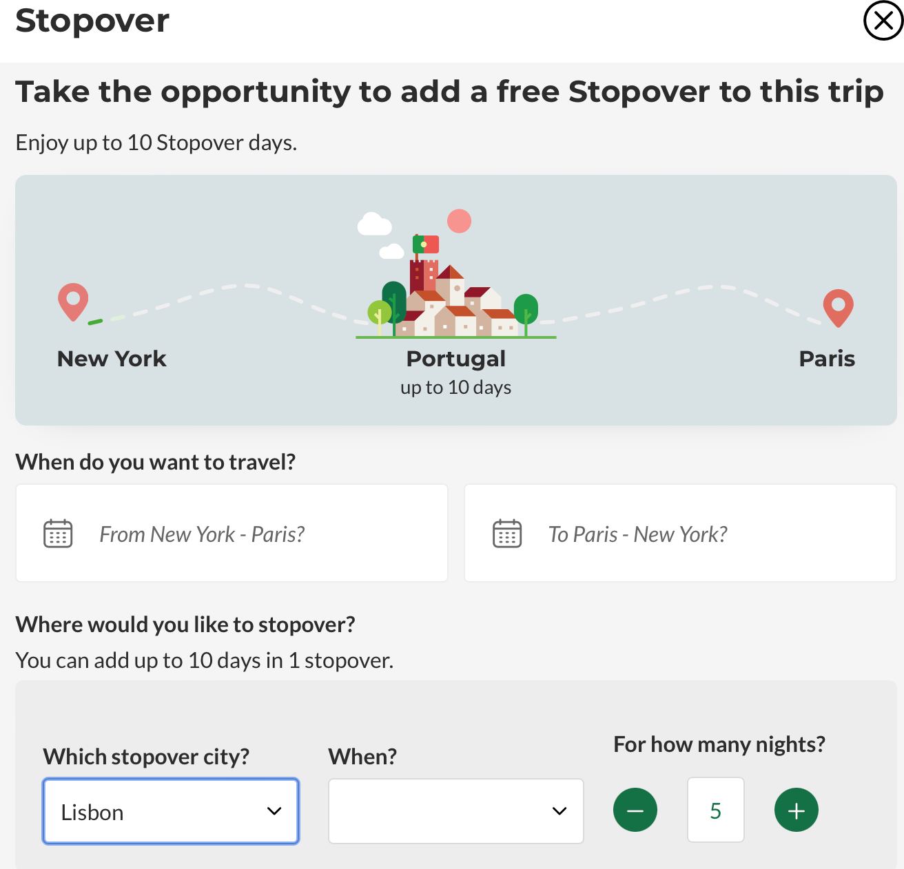 A pop-up screen will appear, giving you the option to add the stopover in either Lisbon or Porto. You can make the stopover up to 10 days for no extra charge.