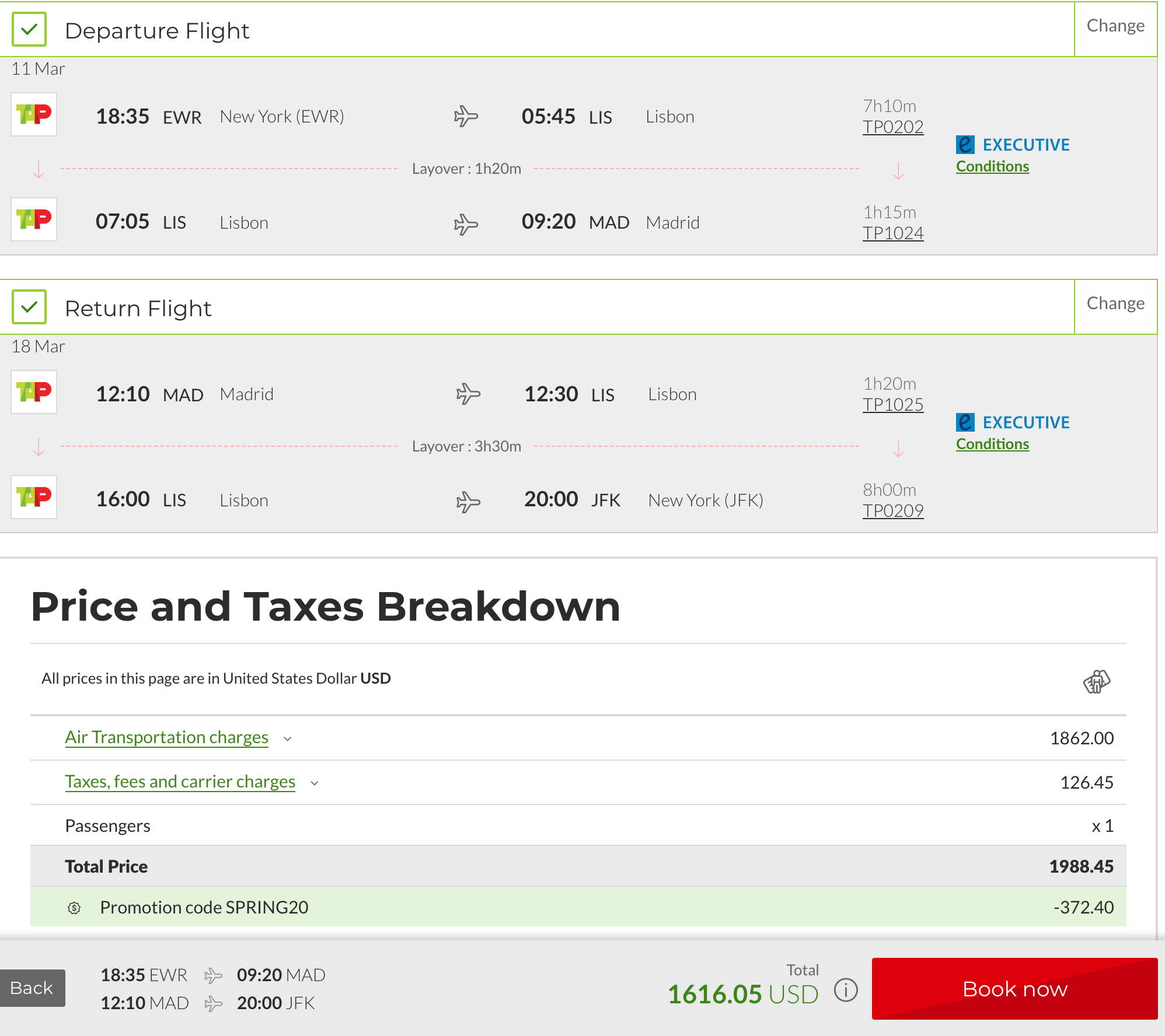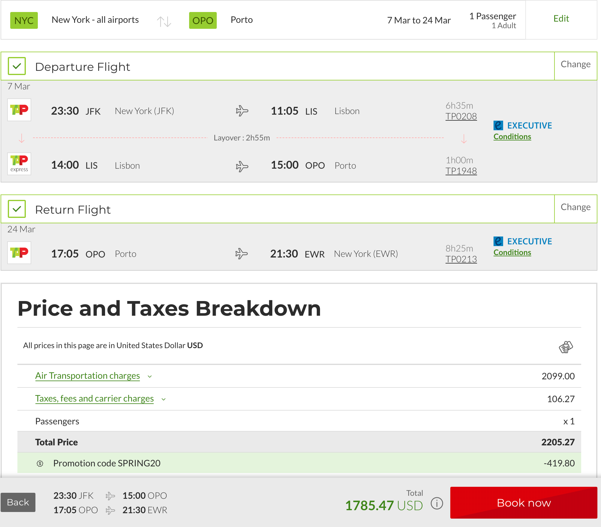 To search, head to TAP's site or Google Flights and enter your origin and destination cities. Scroll through the calendar function to find dates and prices that work for you. Finally, click through to book directly with the airline and don't forget to use the promo code SPRING20.