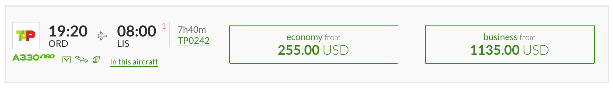 Chicago (ORD) to Lisbon (LIS) for $1,786 round-trip nonstop in business:
