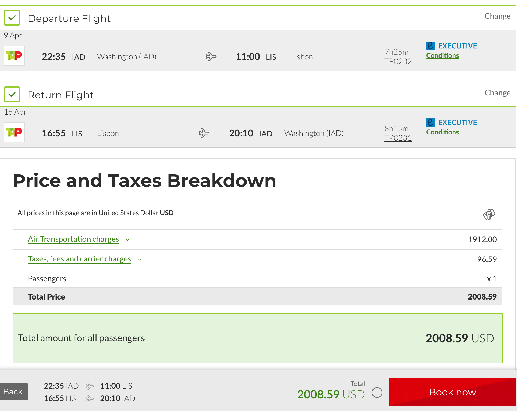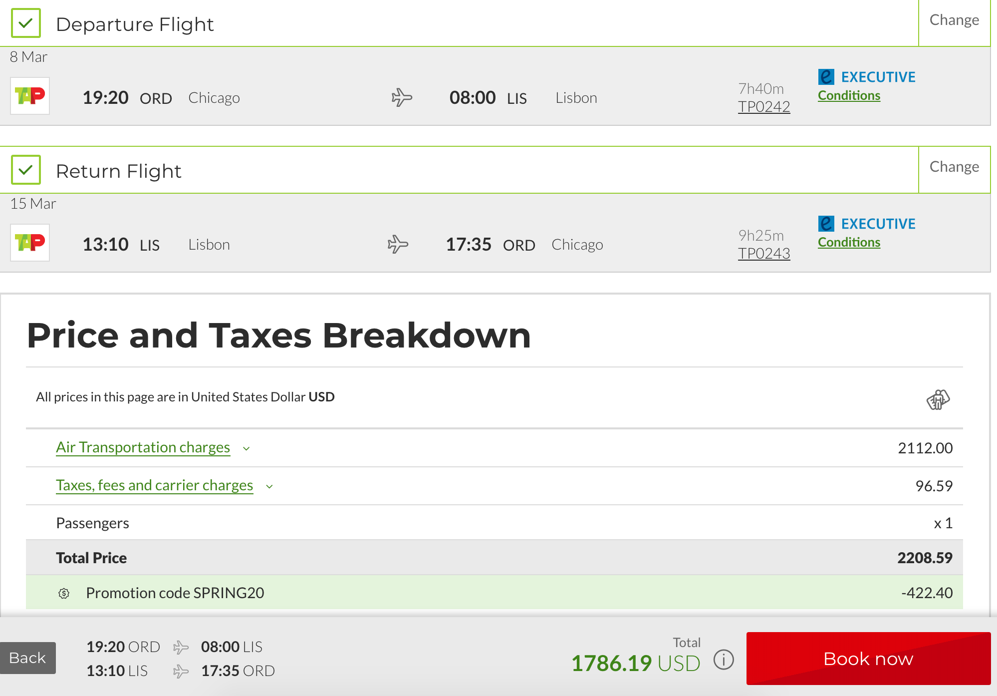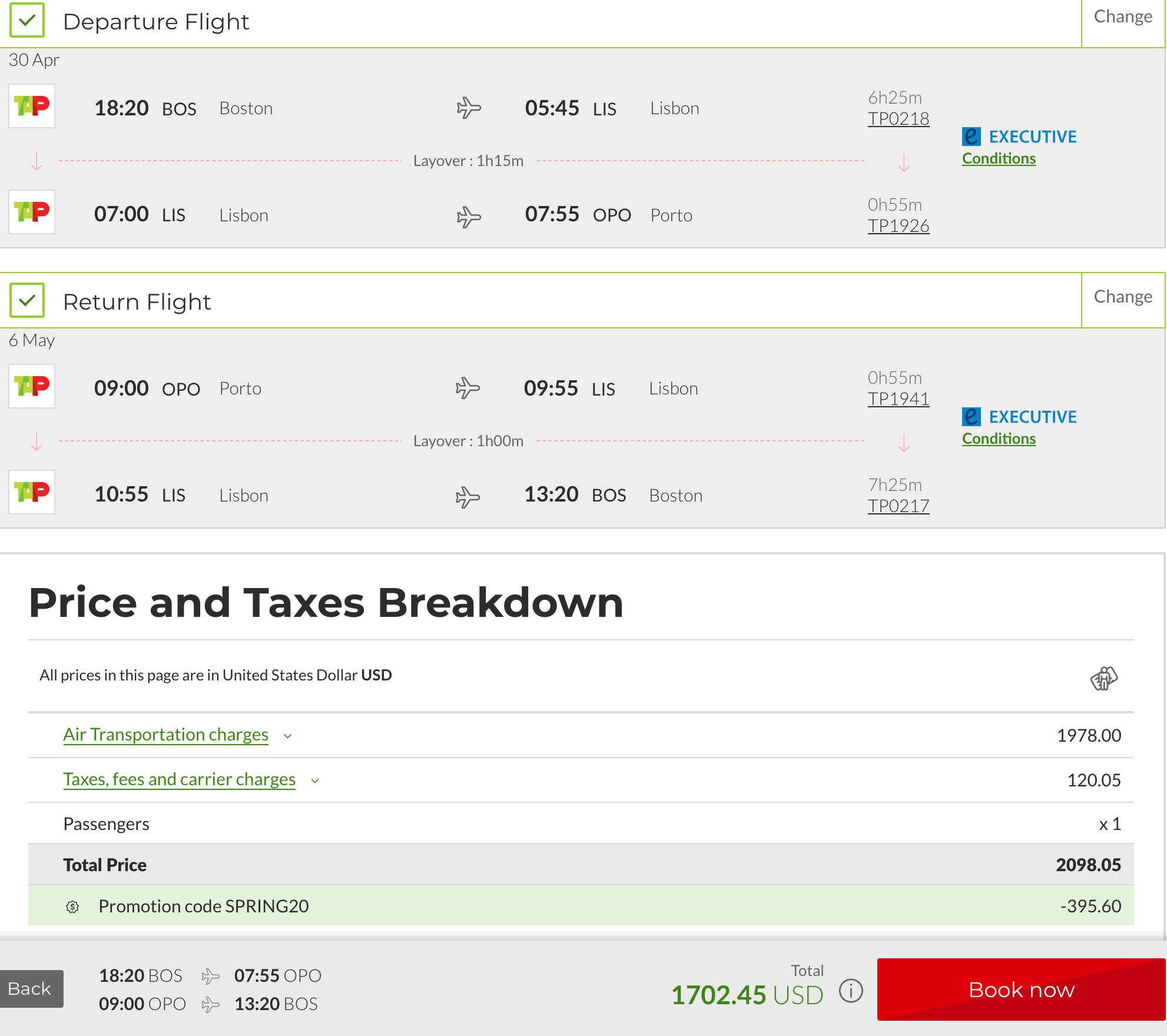 You can search for the deals directly on TAP's site, but I found it to be clunky and unreliable. I ran a Google Flights search to find availability and then entered the dates along with the promo code on the website to find the cheapest fares. The deals are available from March 1 to March 30, 2020, and again from April 21 to May 31, 2020.
