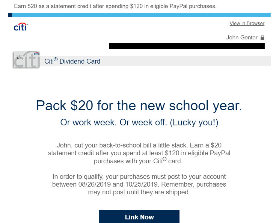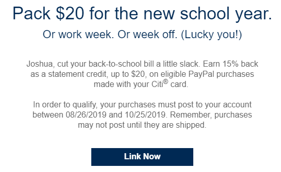 For instance, TPG's Josh Leibner was targeted for 15% back (up to $20) on PayPal purchases on the Citi Prestige. He'd have to spend $134 through PayPal to max out the deal.