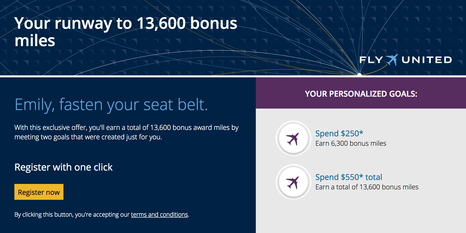 To check to see if you were targeted for this promotion, head to the Runway promotions page on United's site. Enter your MileagePlus number and click through to view your offer. If it looks appealing, click Register now, and you're set to start working toward your goals for bonus miles.