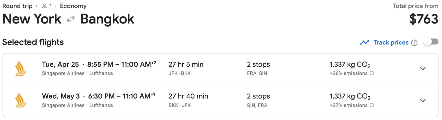 You can book a flight on Singapore Airlines out of New York City's John F. Kennedy International Airport (JFK) to Suvarnabhumi Airport (BKK) in Bangkok in April for $763 round trip. You'll make two stops, one in Frankfurt and another in Singapore.