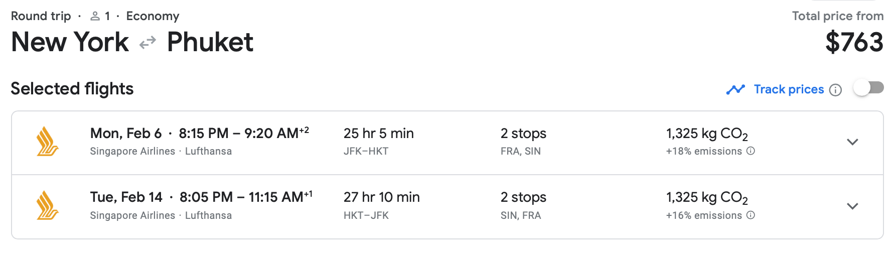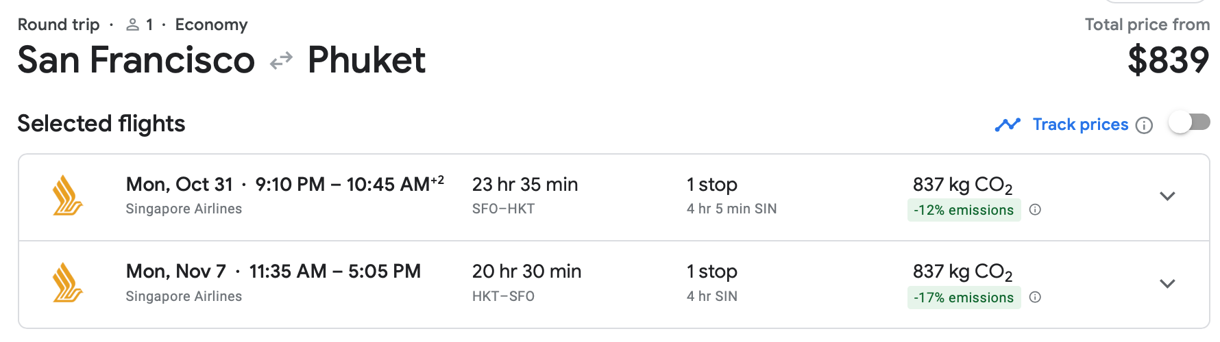 You can also fly from San Francisco to Phuket in October on Singapore Airlines for $839 round trip. October was the only time we still found good availability for this route at this price, so don't wait too long to book this one.