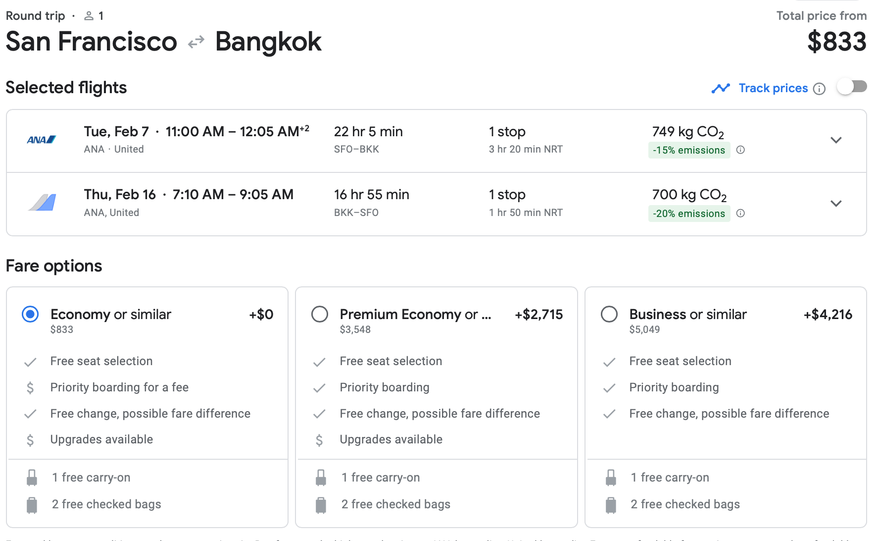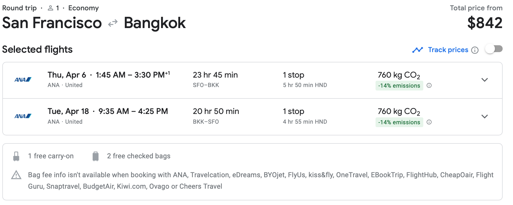 Flights from San Francisco International Airport (SFO) to Bangkok in early 2023 can be booked on ANA for $833 round trip. Note that this route only has one stop each way.