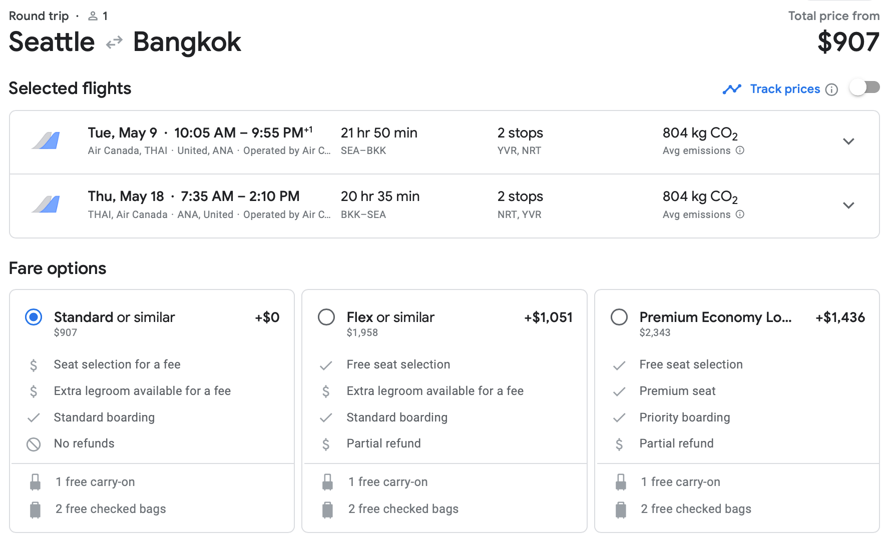 Here is an absolutely fantastic price we stumbled across in this deal. Air Canada has standard economy tickets from Seattle-Tacoma International Airport (SEA) to Bangkok in May for just $907 round trip. You have two layovers going each way -- Vancouver, British Columbia, and Tokyo -- but that is a really good price for this route.