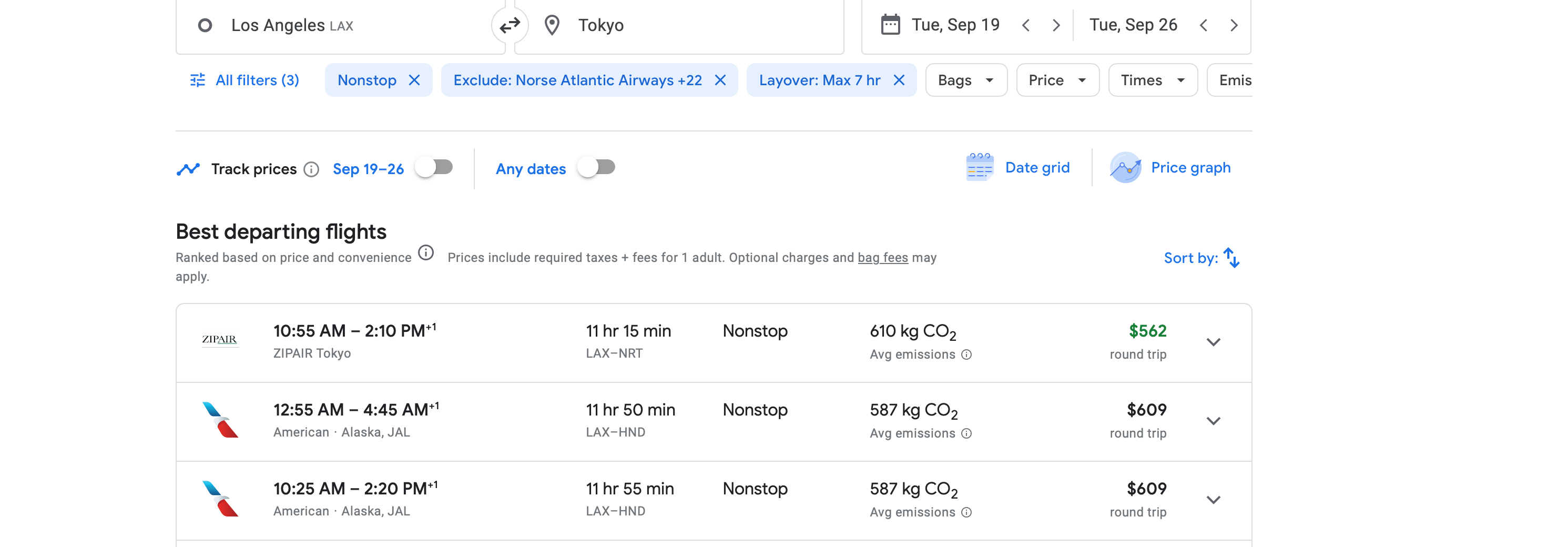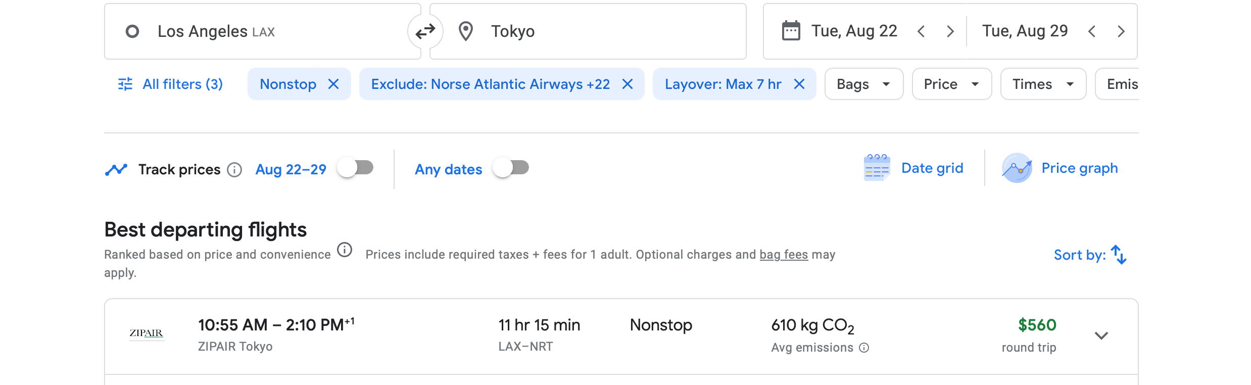 While Zipair Tokyo has the cheapest fare in the example below, note that any bags will cost extra.