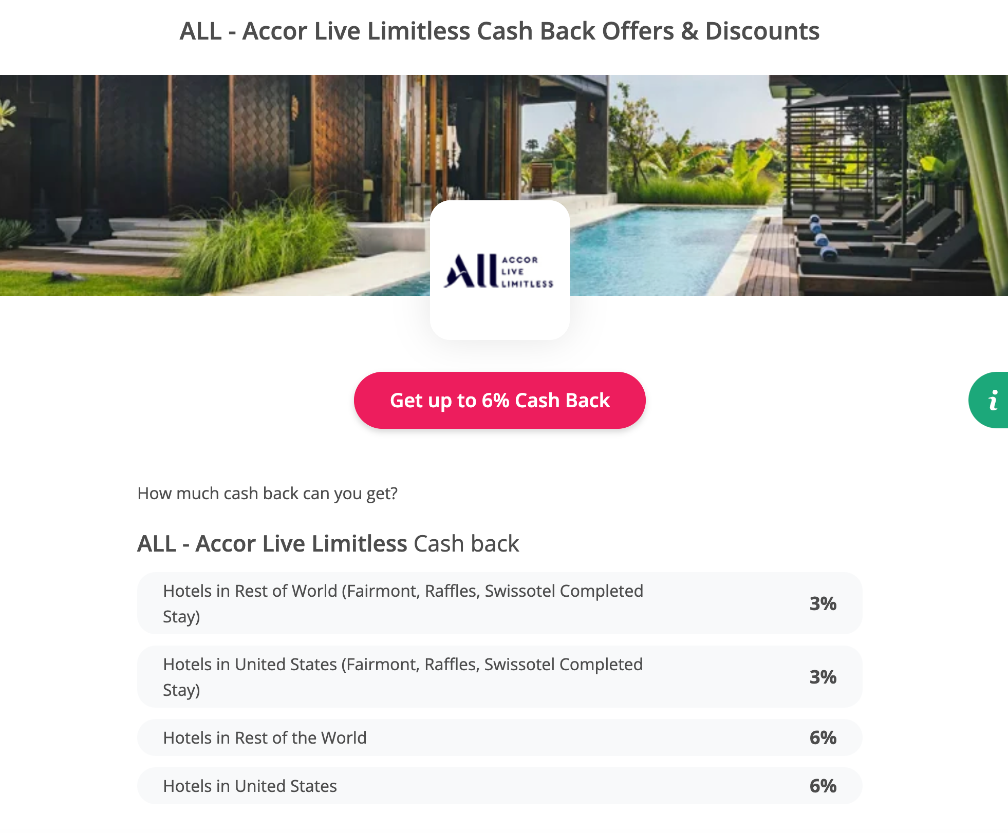 ALL — Accor Live Limitless is offering up to 6% cash back on some stays, too. Fairmont Hotels and Resorts, Raffles Hotels & Resorts and Swissotel Hotels & Resorts bookings earn 3% cash back, while those for other Accor brands in the U.S. earn 6% cash back.