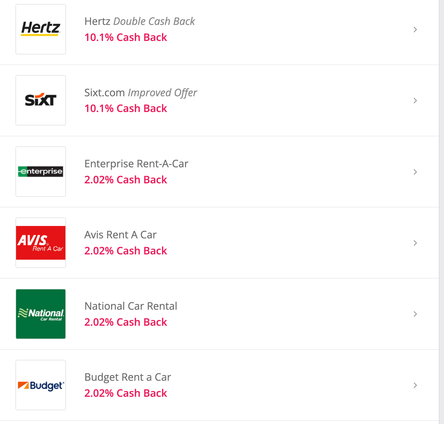 There are also a handful of increased rental car earnings on TopCashBack. Most notably, you can earn 10.1% cash back with Hertz and Sixt, 5.05% cash back on Dollar rentals and 2.02% cash back at most other major U.S. rental car companies, including Enterprise, Avis, Budget and National.