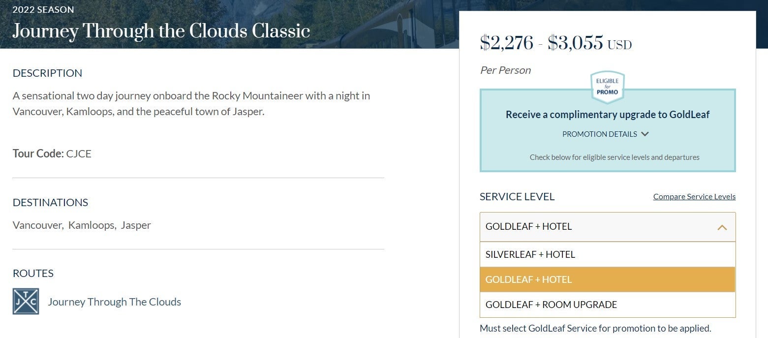 The upgrade is available for travel throughout 2022 with the exception of September. The free GoldLeaf Service upgrade is offered on three-night trips such as the First Passage to the West route, which includes Vancouver, Kamloops, Banff and Lake Louise. You can also take the Journey Through the Clouds route which consists of the same first two stops on the First Passage and ends in Jasper National Park. You can also use the upgrade for a longer passage with the Circle Journey package, which is a combination of both routes.