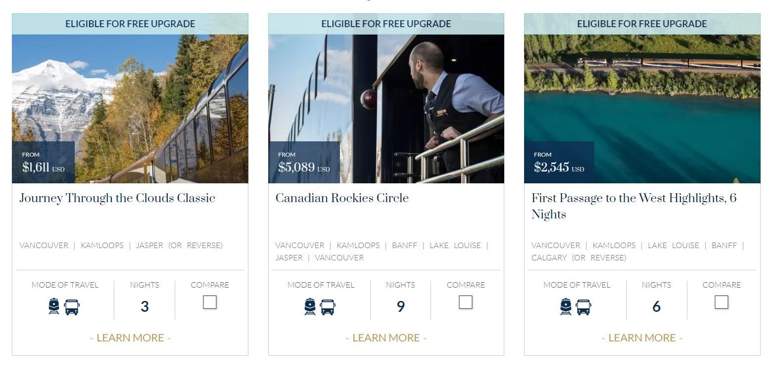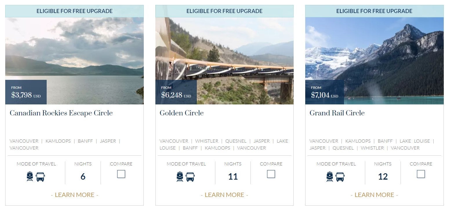 There are also longer routes that you can get the free upgrade on including a 12-night Grand Rail Circle priced at $7,104. The upgrade is not valid on the Rockies to the Red Rocks or Rainforest to Gold Rush routes.
