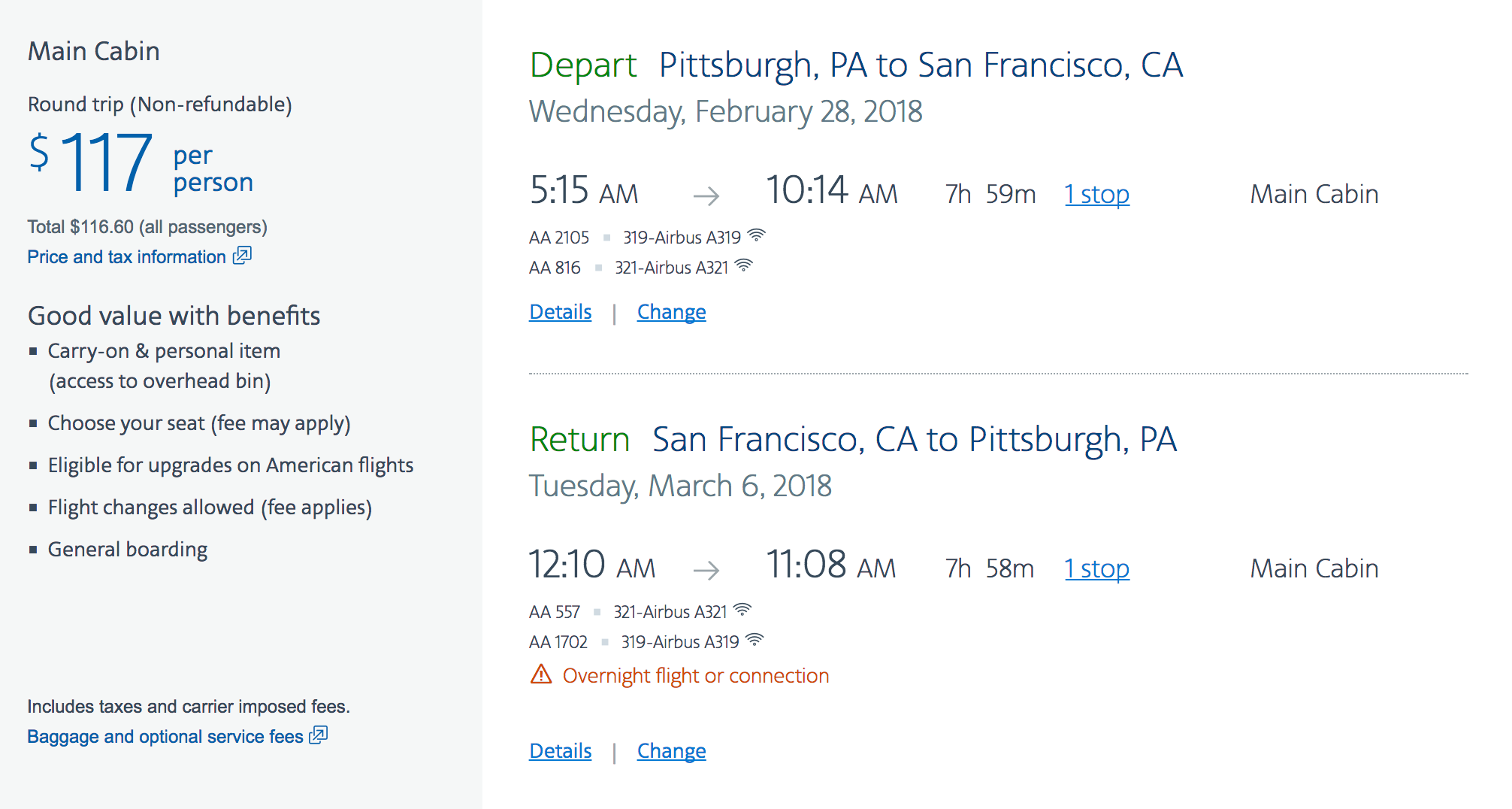 Pittsburgh (PIT) to San Francisco (SFO) for $117 round-trip in Main Cabin with American:
