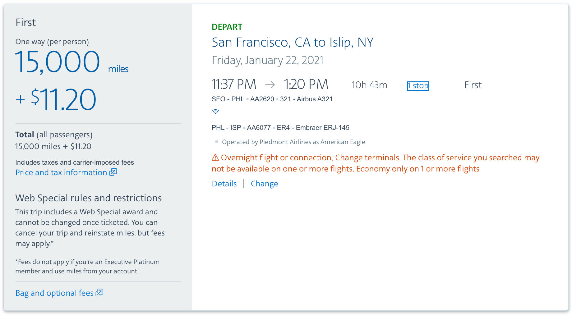 The cheapest awards are available for one-stop cross-country itineraries, such as from San Francisco (SFO) to Long Island/MacArthur (ISP), and start at 15,000 miles each way for first class. These flights typically only offer standard domestic first-class recliner seats.