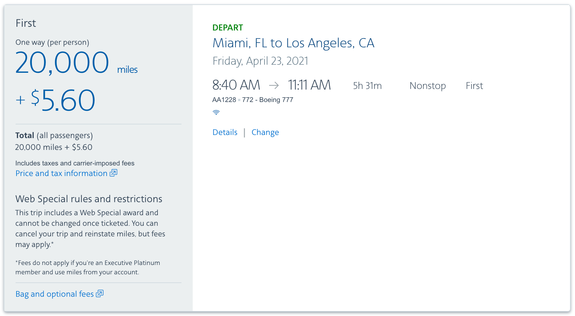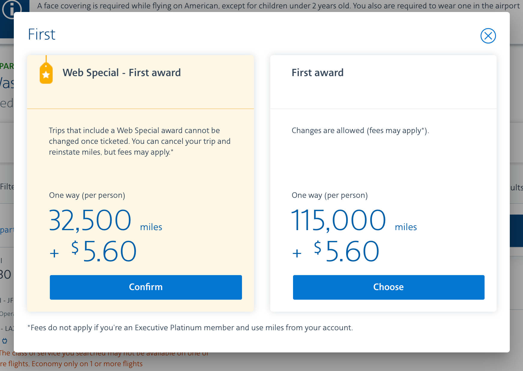 Per the American Airlines award chart, domestic first-class awards greater than 500 miles ordinarily cost 25,000 miles each way (32,500 miles if the award includes travel on an aircraft with lie-flat seats and 50,000 miles for Flagship First) – and that's assuming you're able to find saver availability. So, you can easily save 50% or more through these web specials.