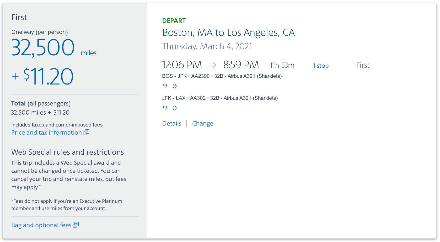 In fact, these "premium" one-stop itineraries offer even lower rates in Flagship First than if you were to book a route like New York to Los Angeles outright. For instance, you could book Boston to Los Angeles via New York for just 32,500 miles in Flagship First.