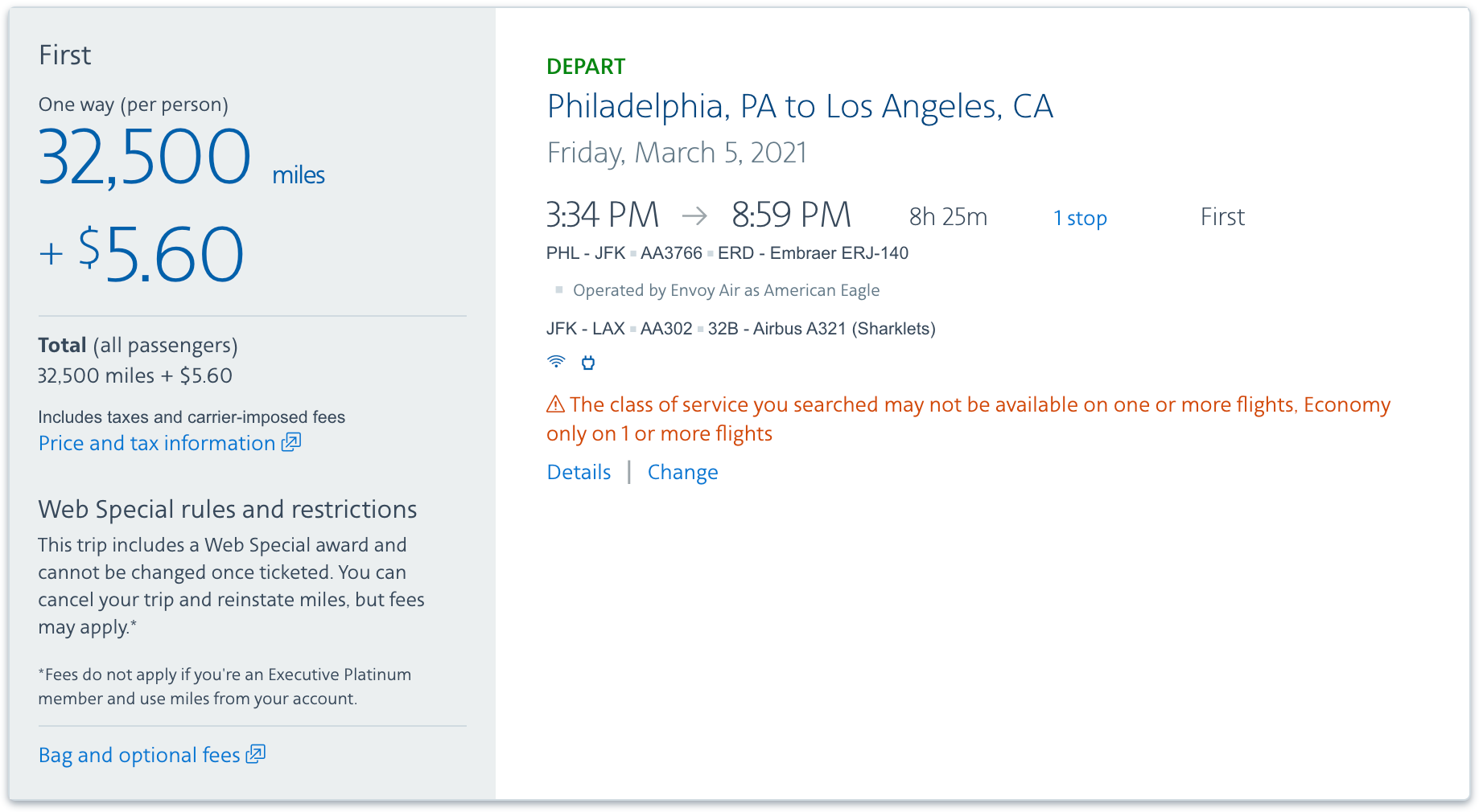 You can currently book domestic business and first-class awards from just 15,000 American AAdvantage miles each way. That's equivalent $210 based on TPG valuations – in other words, the price of coach.