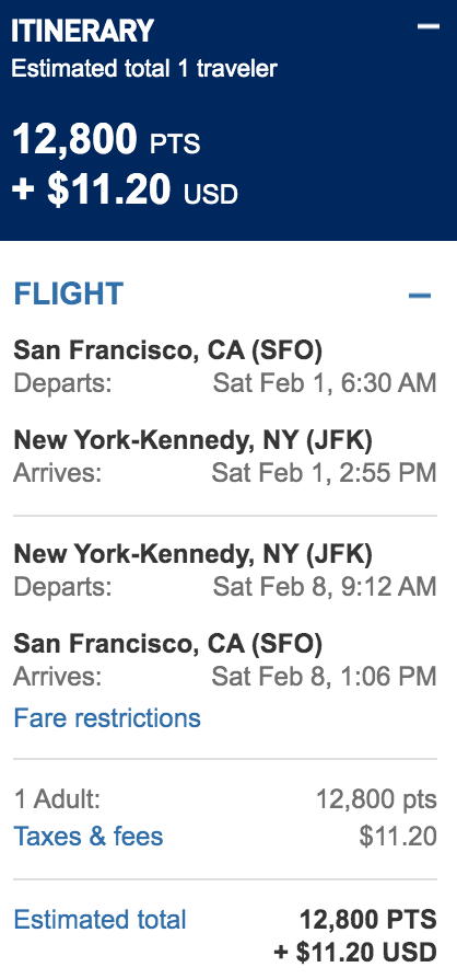 San Francisco (SFO) to New York (JFK) for 12,800 TrueBlue points + $11.20 round-trip nonstop: