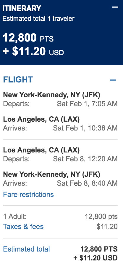 New York (JFK) to Los Angeles (LAX) for 12,800 TrueBlue points + $11.20 round-trip nonstop: