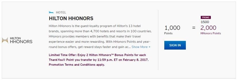 Need a few more Hilton points to top off your account for a redemption? Good news! Now through February 8, you'll earn a bonus when transferring ThankYou points to Hilton. The standard rate is 1 ThankYou point to 1.5 HHonors points, but with this bonus, you'll end up with 2,000 HHonors points for every 1,000 ThankYou points you transfer.