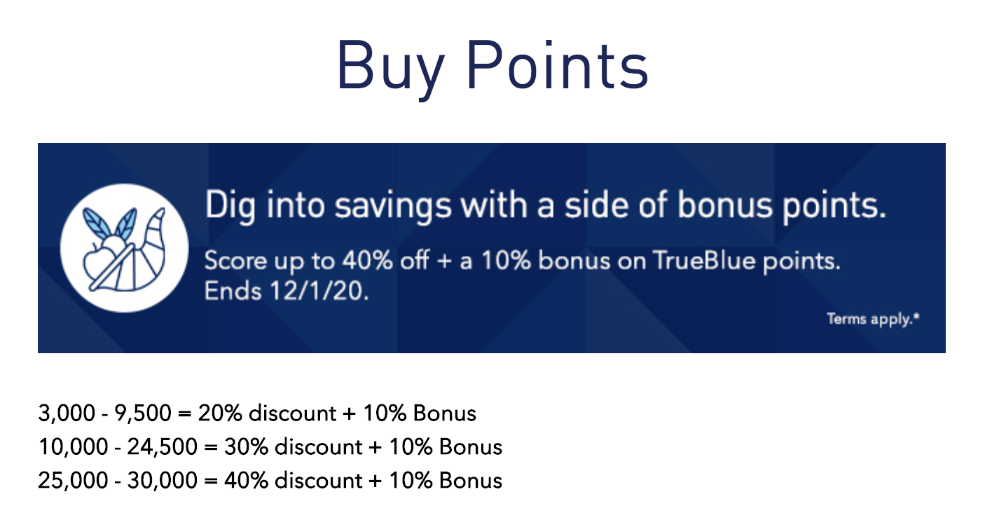 There's also a JetBlue points deal. The airline is offering up to a 40% discount plus a 10% bonus when purchasing TrueBlue points. Purchase between 35,000 to 40,000 points to get the biggest bonus. With this promotion, you are purchasing points for more than what they are worth, but this might be a good opportunity if you are looking to top off a specific award you have your eye on. This promotion goes through Dec. 1, 2020.