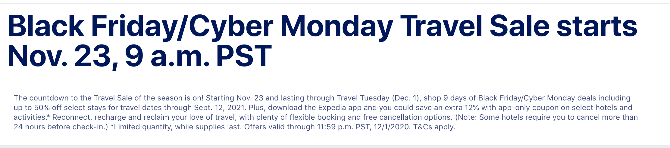 Expedia's nine days of Black Friday/Cyber Monday deals start today with a different deal every day. Separately, if you book a hotel through their app, you can save an extra 12% on select hotels and activities.
