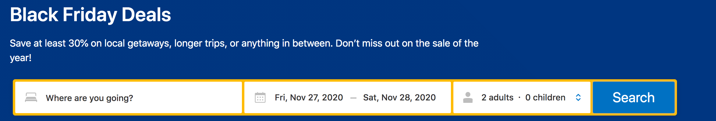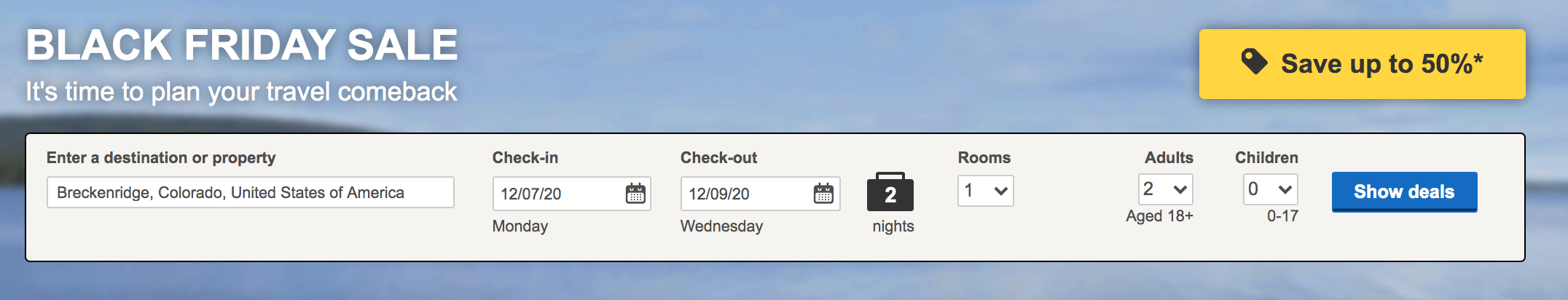 While part of Marriott so you can use your Bonvoy points at its properties, the Gaylord Hotels chain is offering some compelling sales for Black Friday and Cyber Monday with up to 30% off stays in Denver, Nashville, Dallas and Orlando on select dates. Use promo code: 16C. You can also save up to 50% on holiday tickets to events like the I Love Christmas Movies interactive experience. Use code: CYBER20. You must book by Dec. 2 and stay by Jan. 3, 2021.