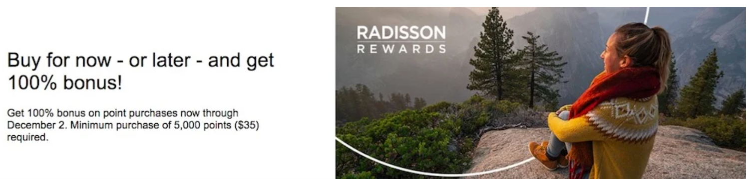 Through Dec. 2, 2020, Radisson Rewards is rewarding its guests with a 100% bonus when you purchase points. You must purchase at least 5,000 points, with a maximum amount of 120,000 points per calendar year (prior to the bonus kicking in). This means you can ultimately purchase 240,000 points through this promotion — which will cost you $840. This brings the price down to 0.35 cents per point.