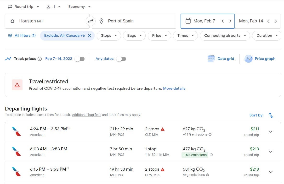 There were also many options throughout February for round-trip flights from Houston (IAH) to Port of Spain (POS) ranging from $211-213.