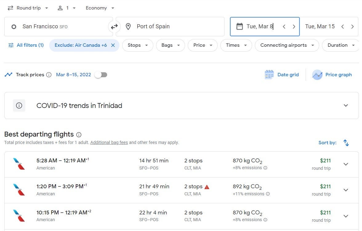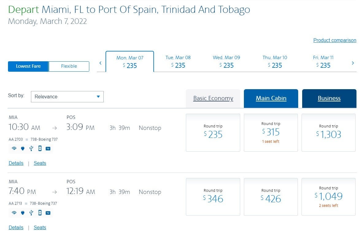 There were many affordable nonstop options throughout January, February and March from Miami (MIA) to Port of Spain (POS) at $235 round-trip.