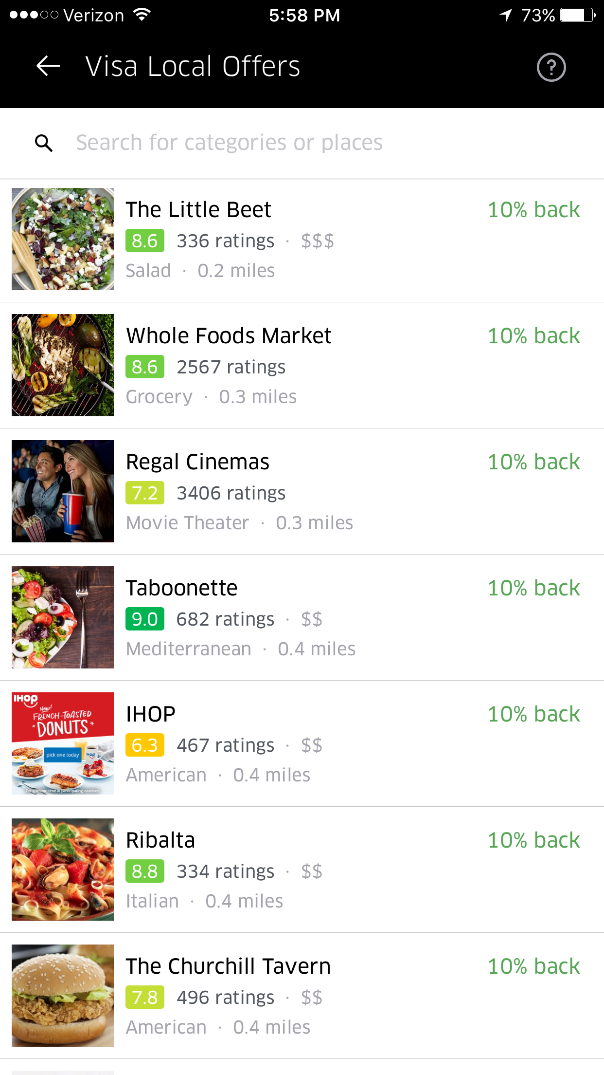 According to Uber, there are thousands of merchants that you can shop with, and from my time scrolling through the offers in New York City, I saw about 75 participating businesses. All the offers in New York displayed that you'd get 10% back in Uber credits from your purchase. The list included a variety of merchants including places like Whole Foods, Regal Cinemas, Walgreens and dozens of restaurants.