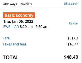 Let's start with this below nonstop flight from New York to D.C. in early January. You'll note a total just short of $49, which includes a base fare of roughly $31 and $17 in taxes and fees.