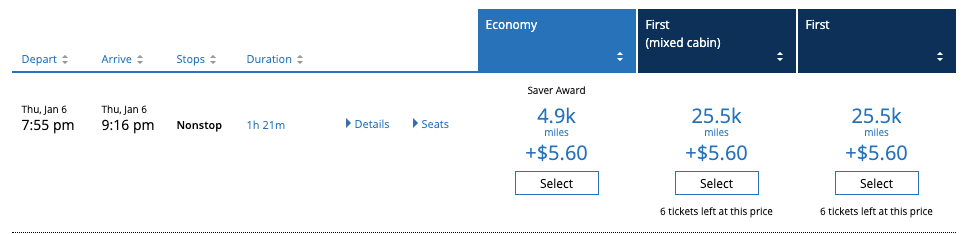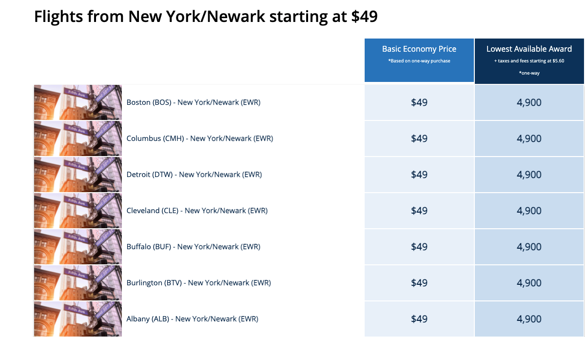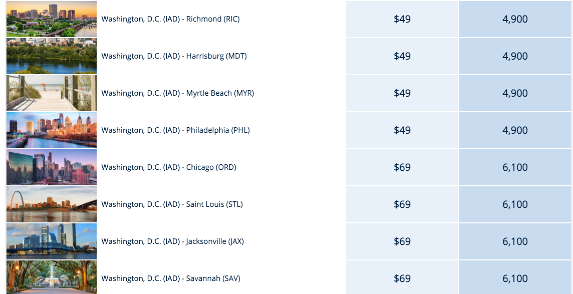 Outside of the $49 fares, you can find one-way economy deals for $69 (or 6,100 miles), $89 (or 7,400 miles), $99 (or 8,000 miles), $119 (or 9,300 miles) and $139 (or 10,500 miles).