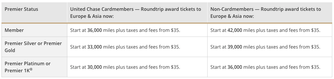 As a Premier 1K member with the United Explorer Card, I'm entitled to the largest discount. As a result, I'm seeing saver awards ranging in price from 30,000 miles (to Europe) to 40,000 miles (to Southeast Asia) round-trip — that represents a very generous 50% discount off the lowest award rates I'm used to seeing for those routes.