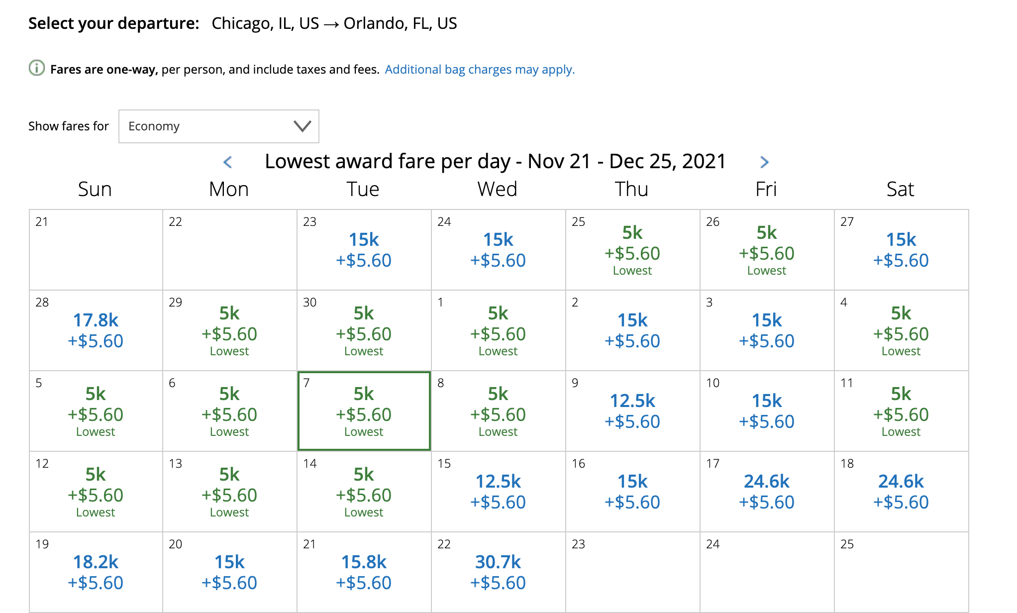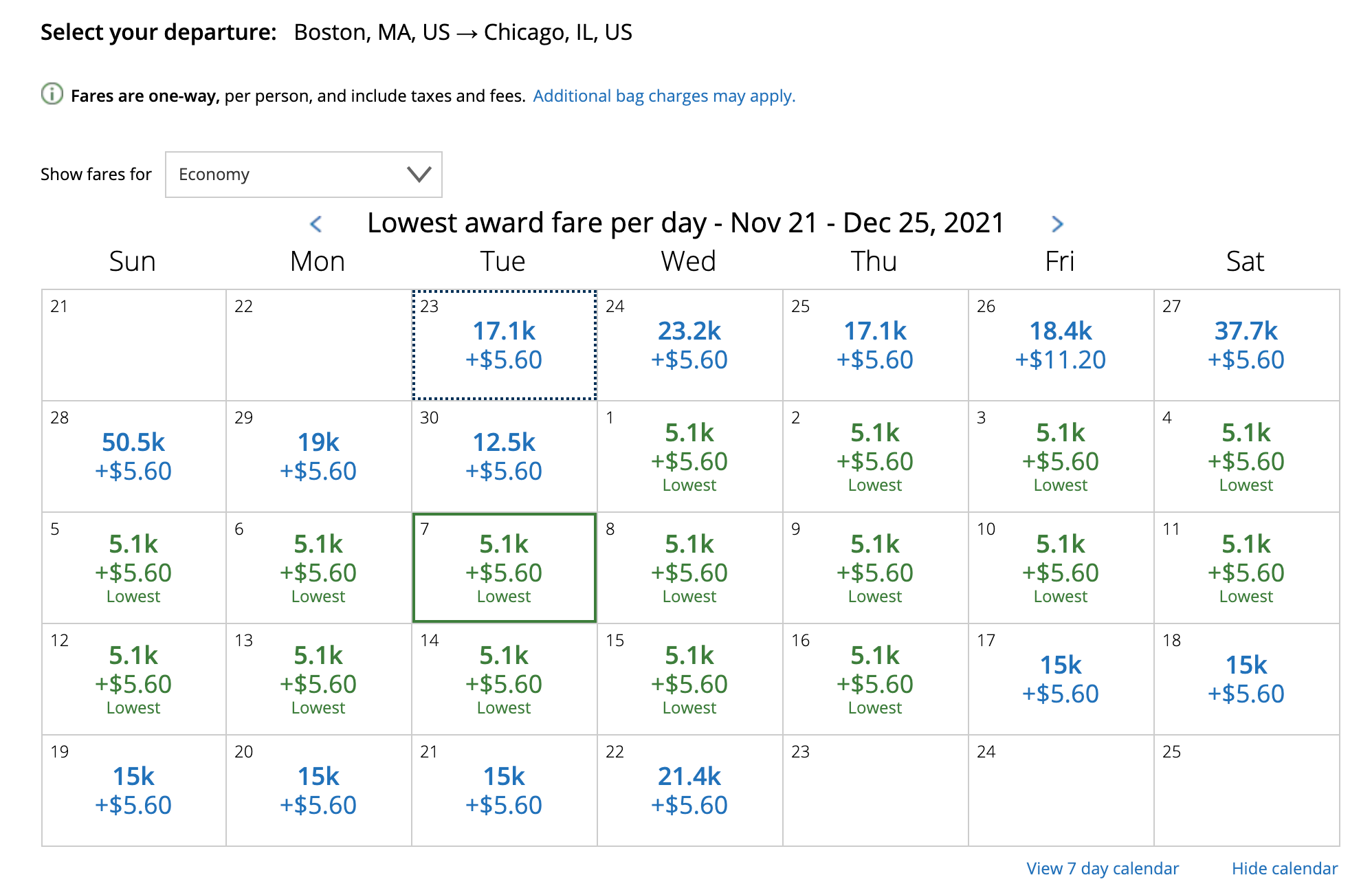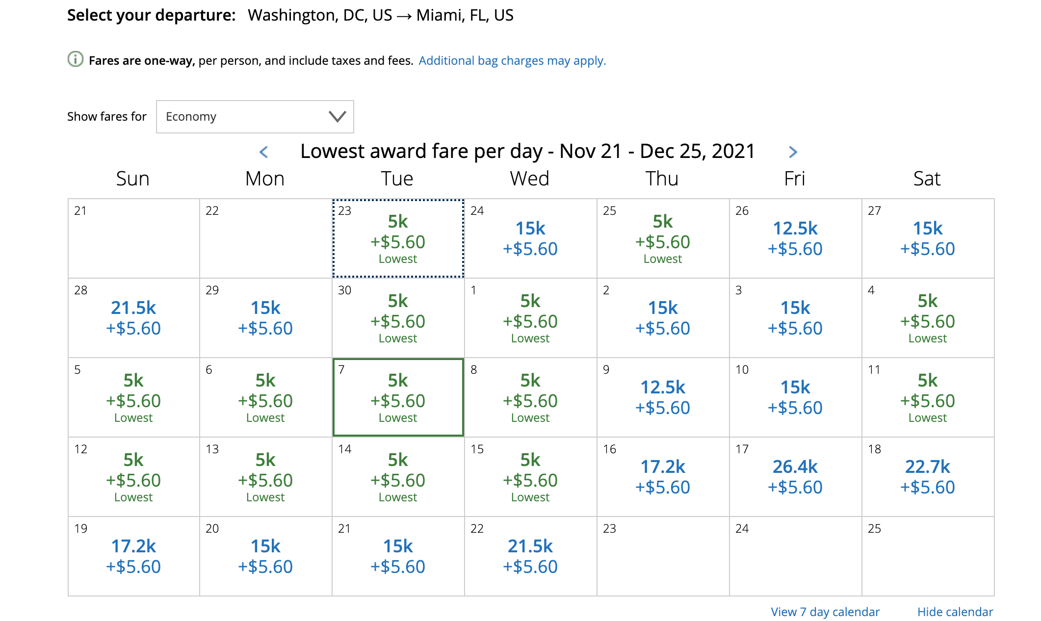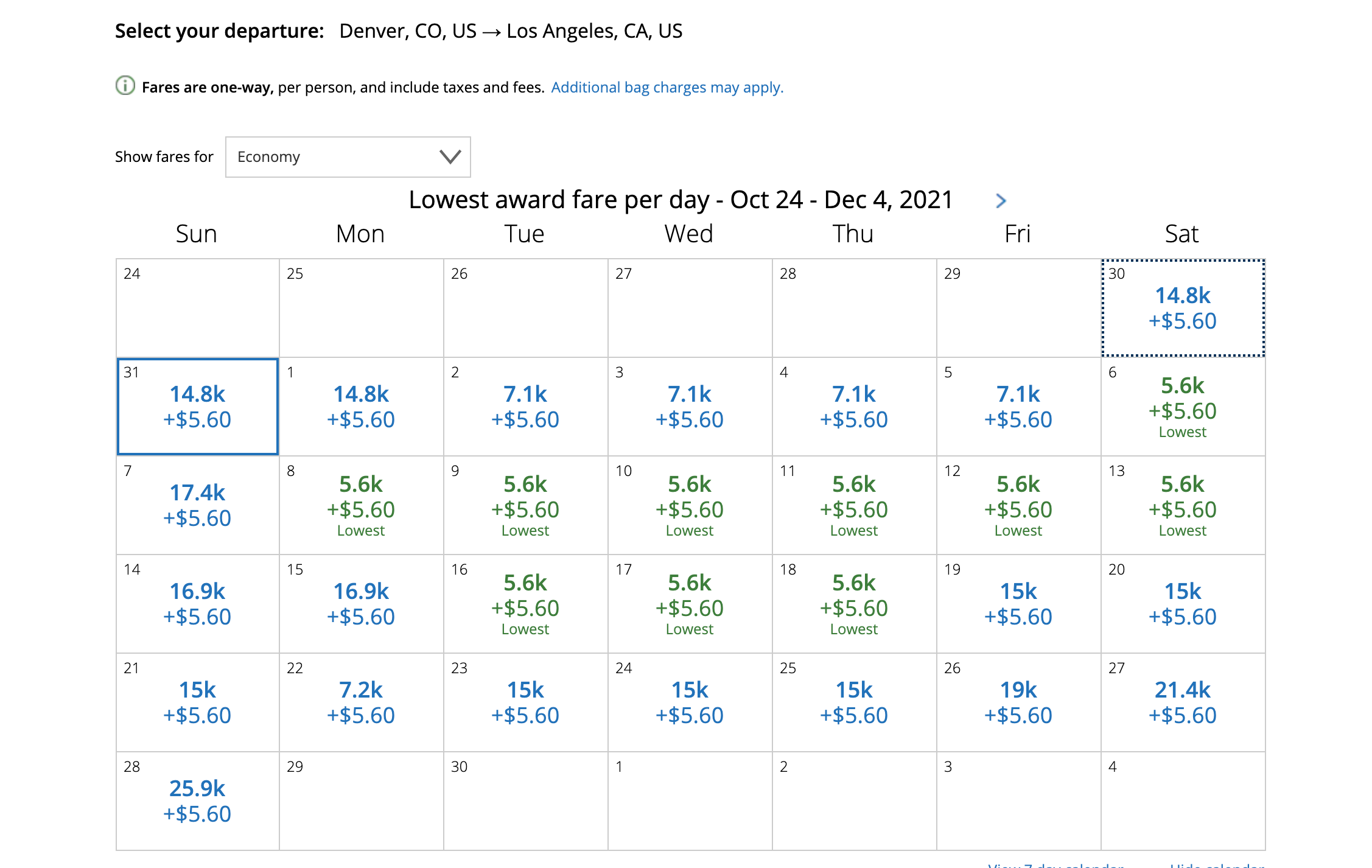 Most of the lowest-priced mileage deals we've come across are from November 2021 through March 2022 travel, though the only way to know for sure what your route may cost is to run a search and use the 30-day calendar view if you have some flexibility in travel dates.