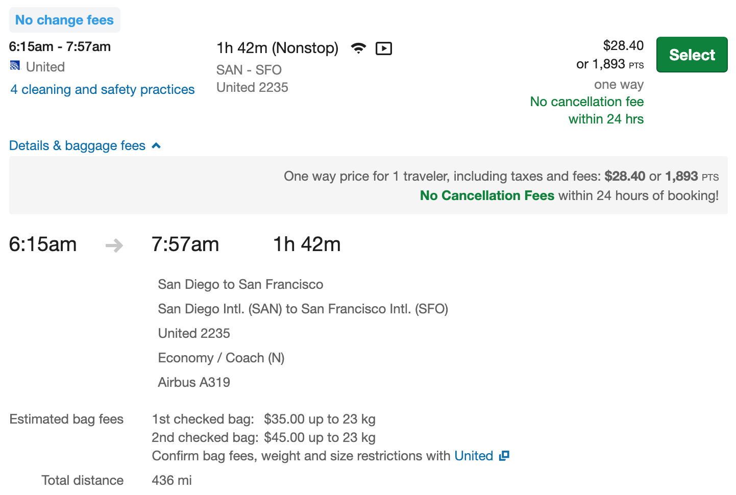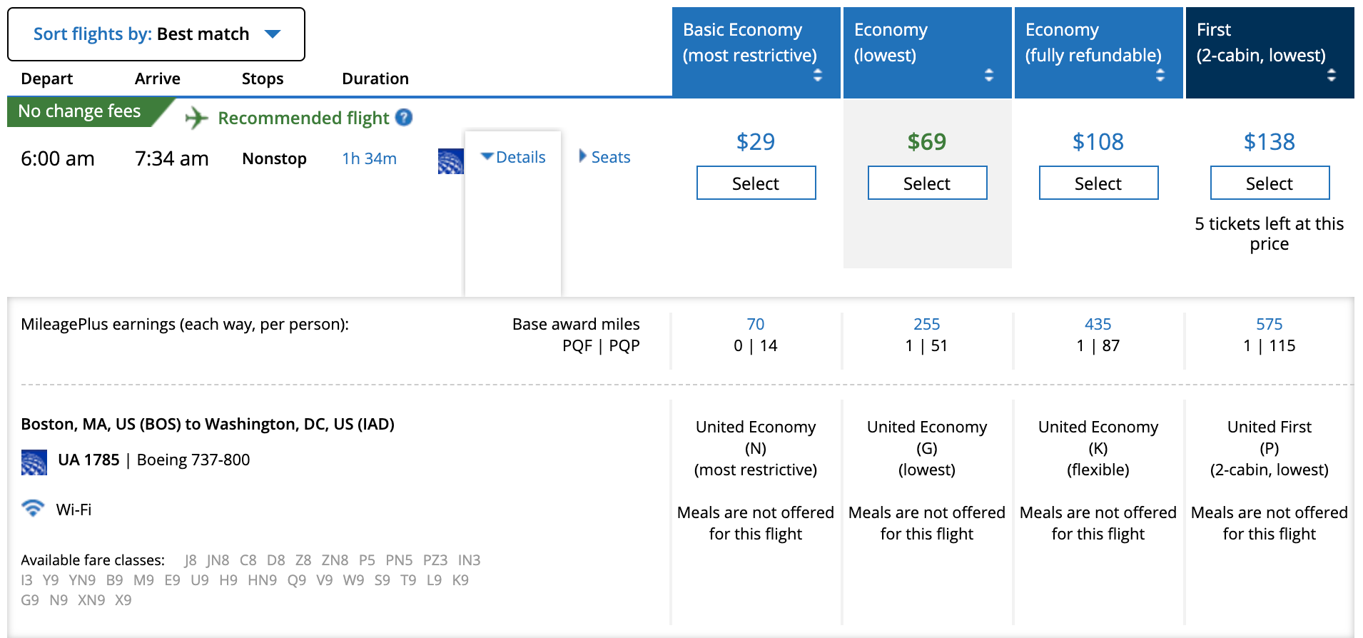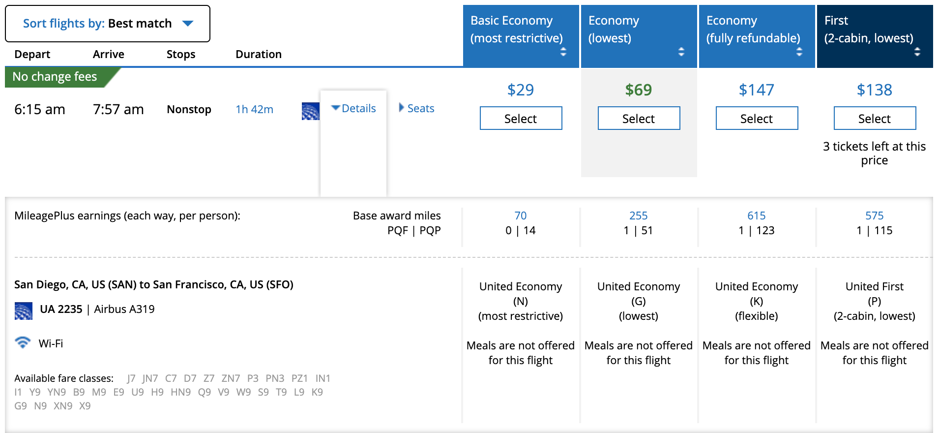 You can book these flights for $29 each way, but the lowest fares generally require traveling in basic economy, without a seat assignment or carry-on bag. Note that free changes are permitted for all United flights issued by March 31, 2021, including basic economy.