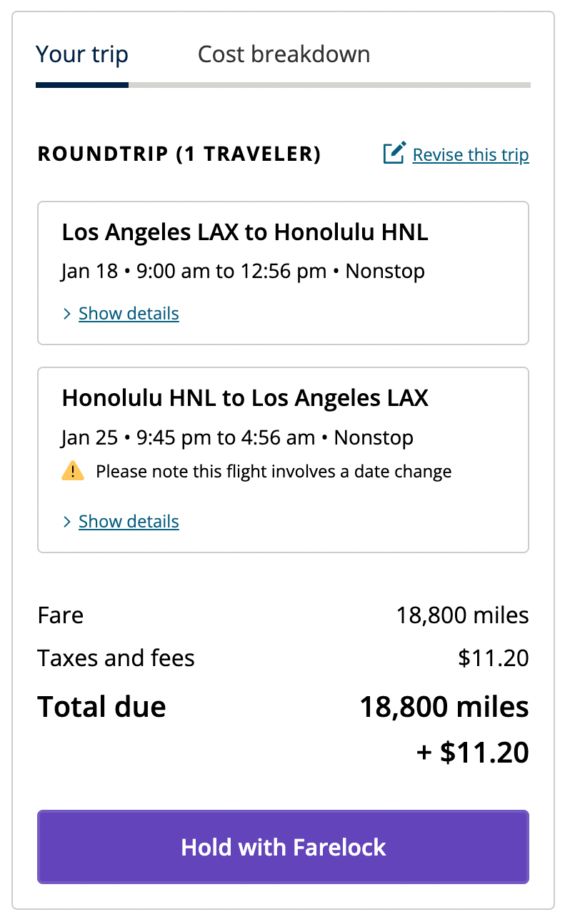 The 9,400 miles only apply to one way — a round-trip flight from Los Angeles to Honolulu will come to 18,800 miles. TPG’s August 2022 valuations place United’s MileagePlus program at 1.21 cents per mile.