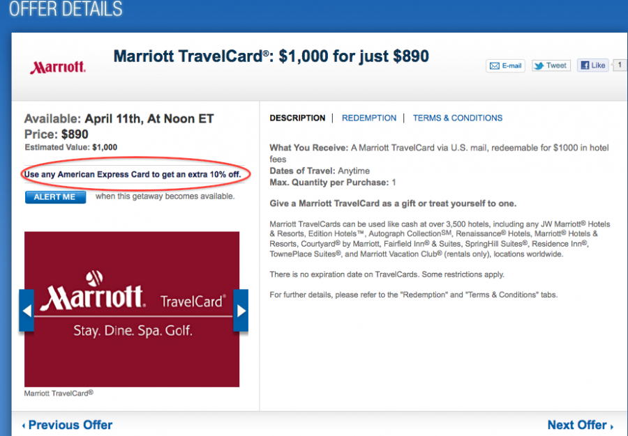 Today is Marriott and they have gift certificates for 11% off. However, if you use an American Express card to pay for the purchase, you get an additional 10% discount, bringing the total discount to 20%. Gift card denominations are: