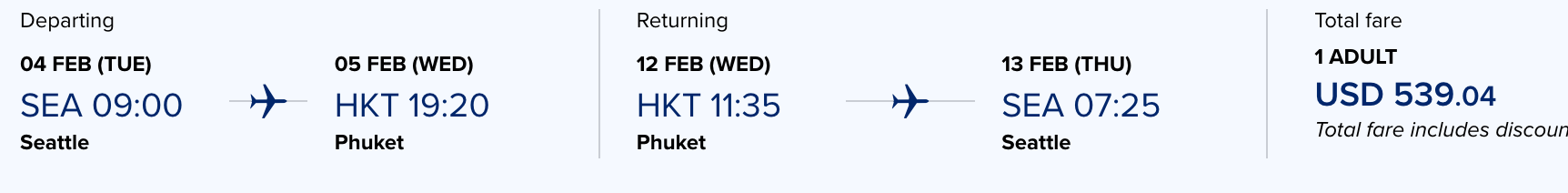Seattle (SEA) to Phuket (HKT) for $539 round-trip on Singapore (long layover in SIN):