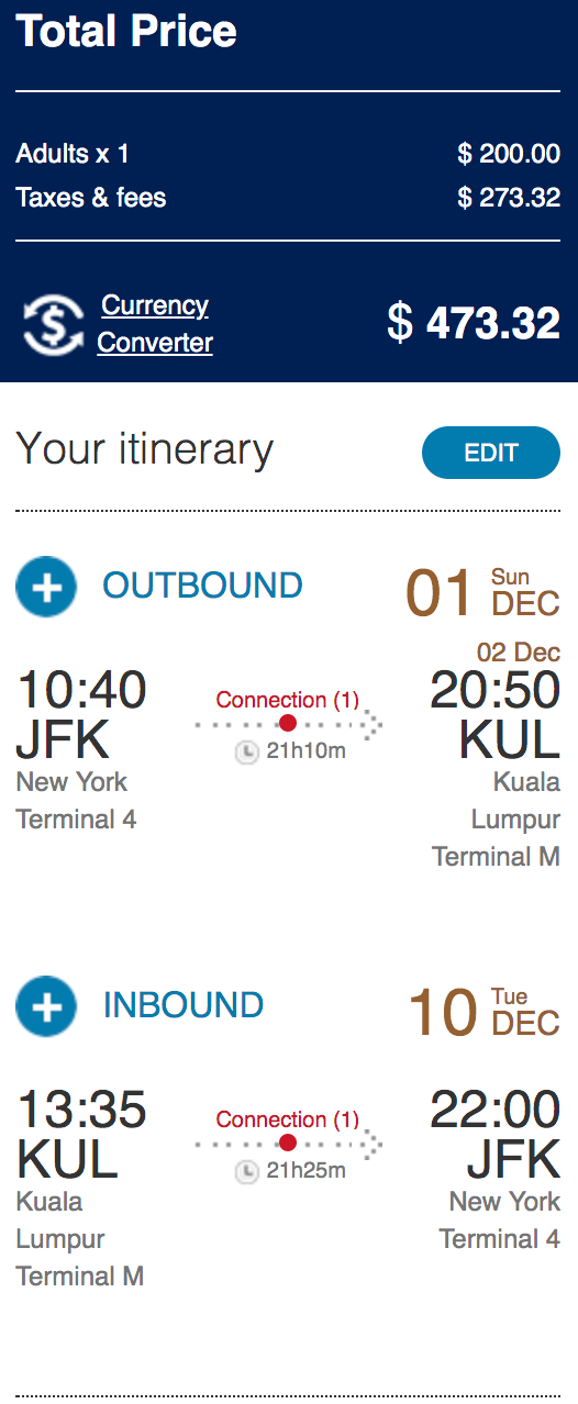 New York (JFK) to Kuala Lumpur (KUL) for $473 round-trip on China Southern: