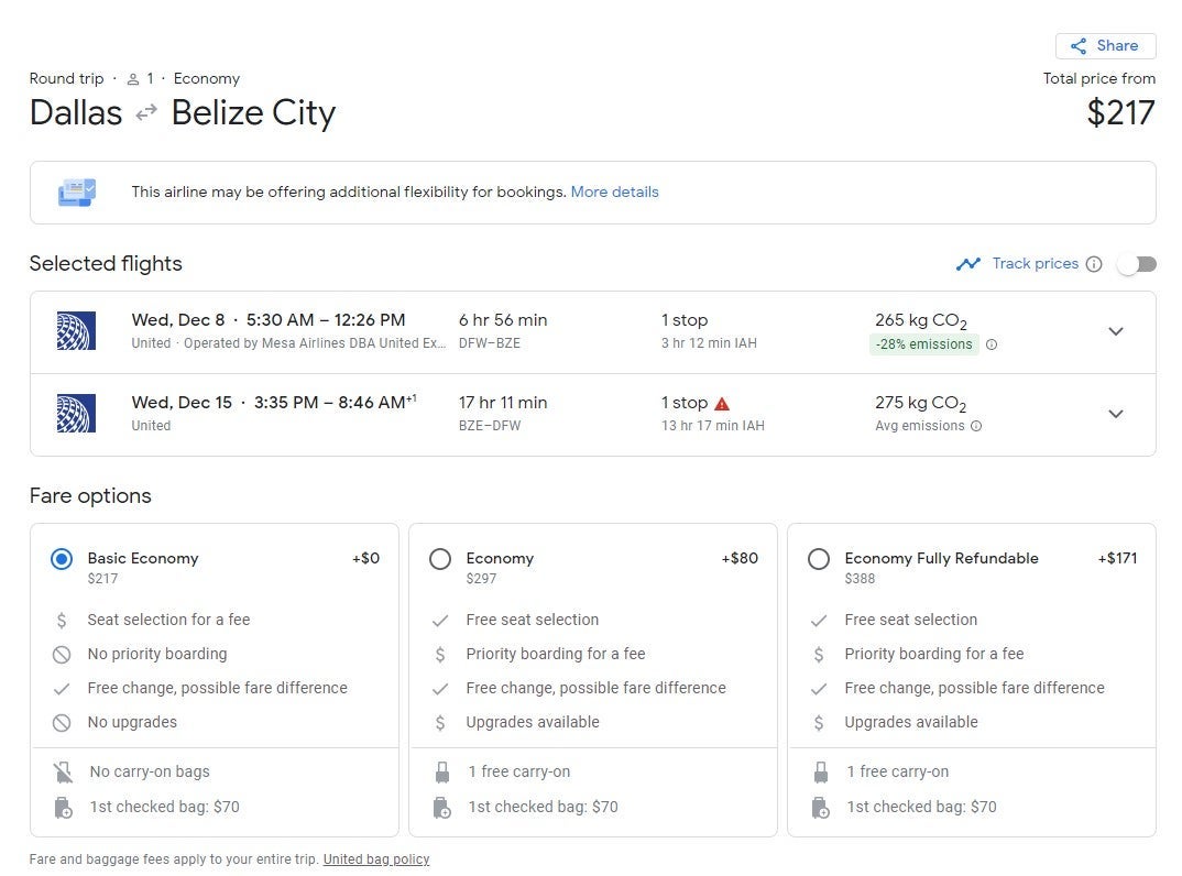 Availability in December is limited, but if you're able to jump on this deal, you can make it to Belize City (BZE) from Dallas (DFW) for $217 round-trip on United. The flights are operated by United Express, and involve one stop each way. This is a United basic economy ticket, which means you will have to pay for a seat assignment, carry-on bag and checked bag.