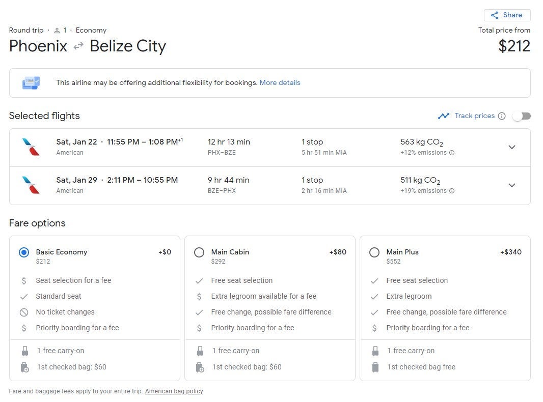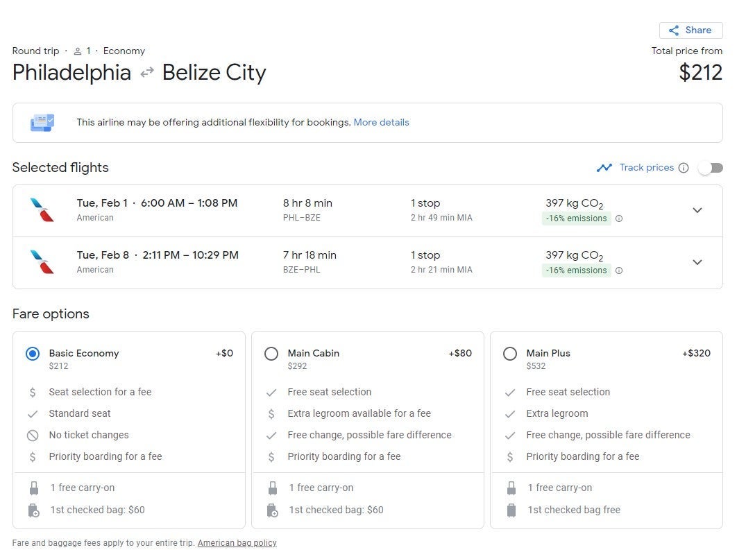 We found availability in February on American Airlines from Philadelphia (PHL) to Belize City (BZE) with a stop in Miami for $212 round-trip. This basic economy fare allows you one free carry-on.