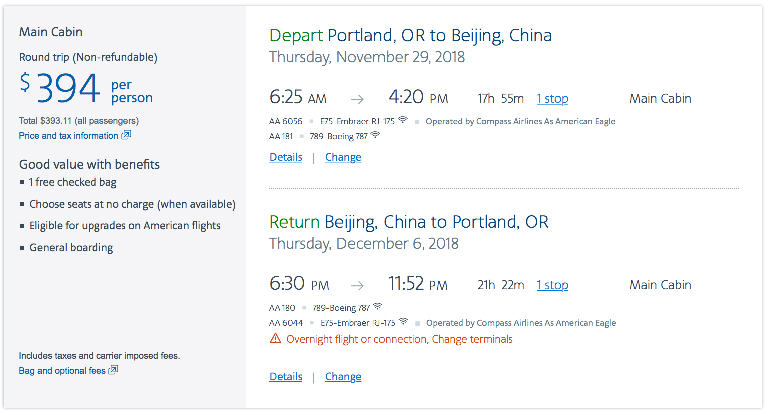 American Airlines is currently offering cheap flights to Beijing (PEK) and Shanghai (PVG) from Delta hub cities across the US, such as Portland (PDX), Seattle (SEA) and Minneapolis (MSP). The fares start at $394 round-trip and are available for travel from September 2018 through May 2019. Besides getting you to China on the cheap, these fares could significantly boost your American AAdvantage mileage balance and help you earn elite status quicker. You can read more on the special tricks to maximize your mileage earning on American Airlines flights after the flight booking examples, below.