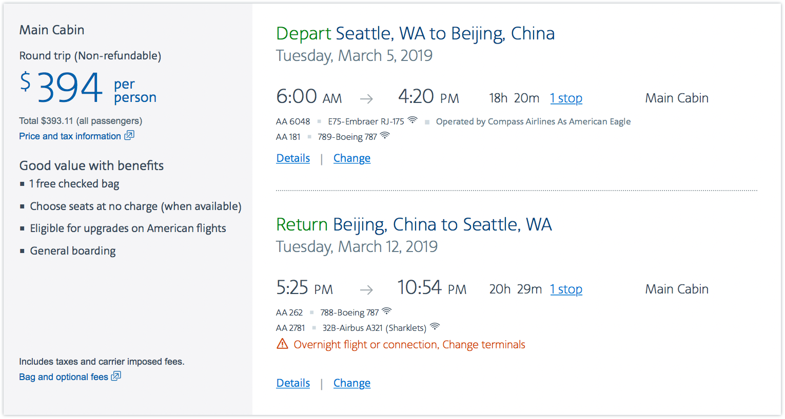 Seattle (SEA) to Beijing (PEK) in March 2019 for $394 round-trip on American: