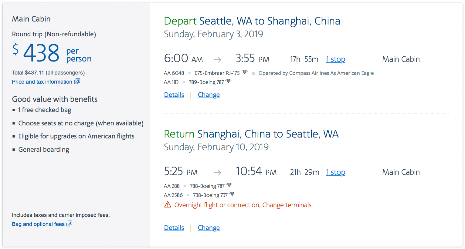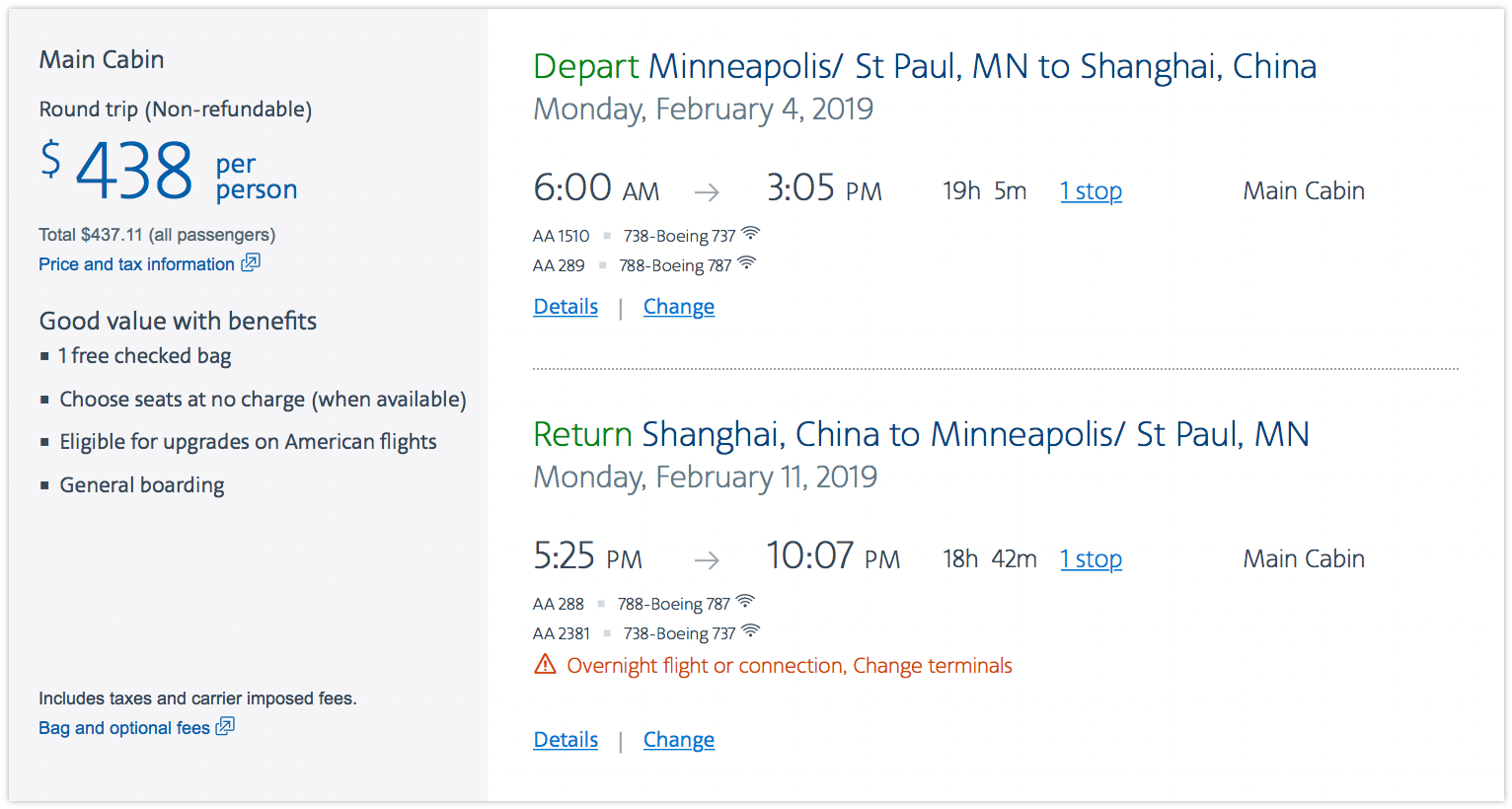 Minneapolis (MSP) to Shanghai (PVG) in February 2019 for $438 round-trip on American: