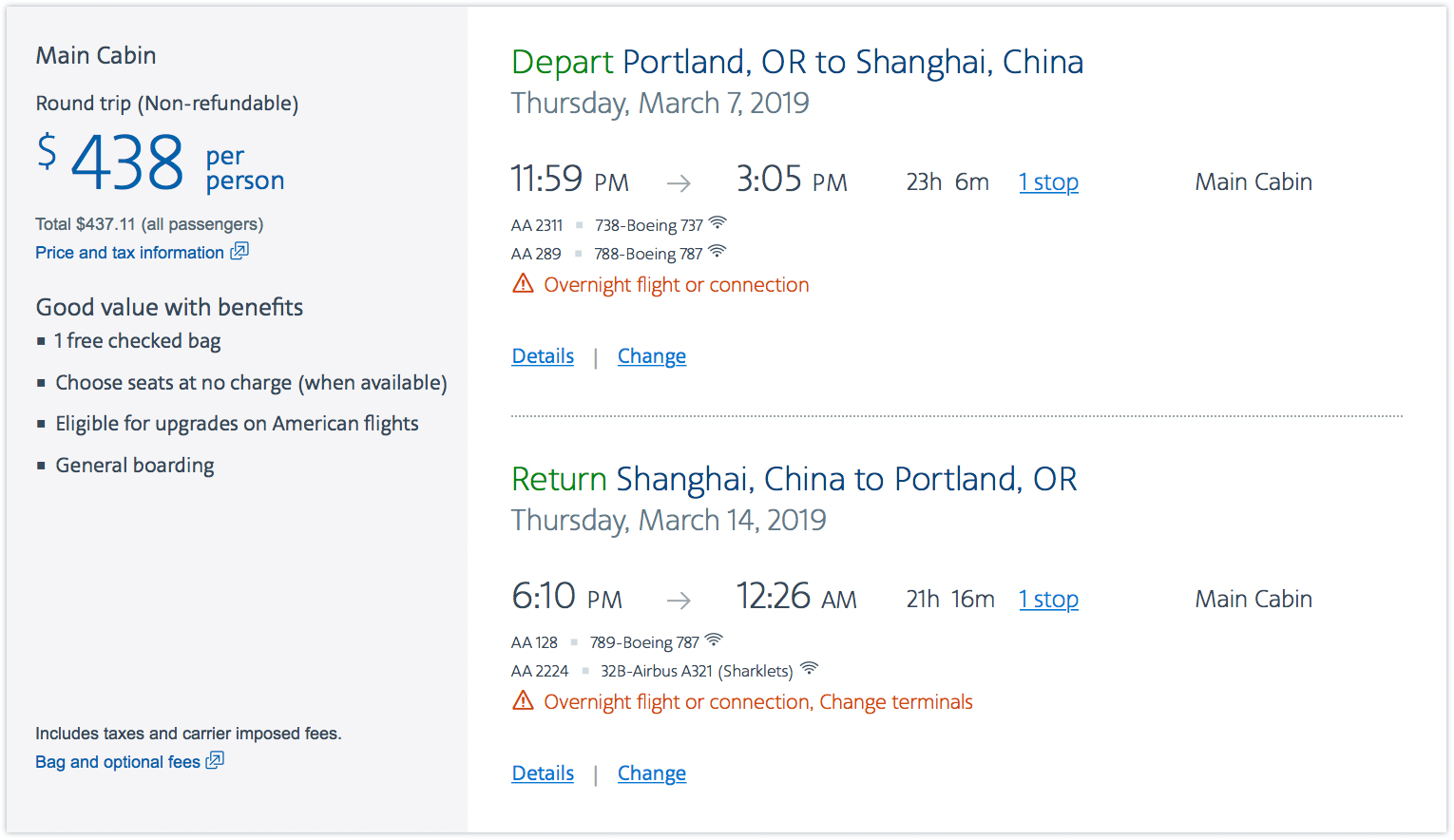 Portland (PDX) to Shanghai (PVG) in March 2019 for $438 round-trip on American: