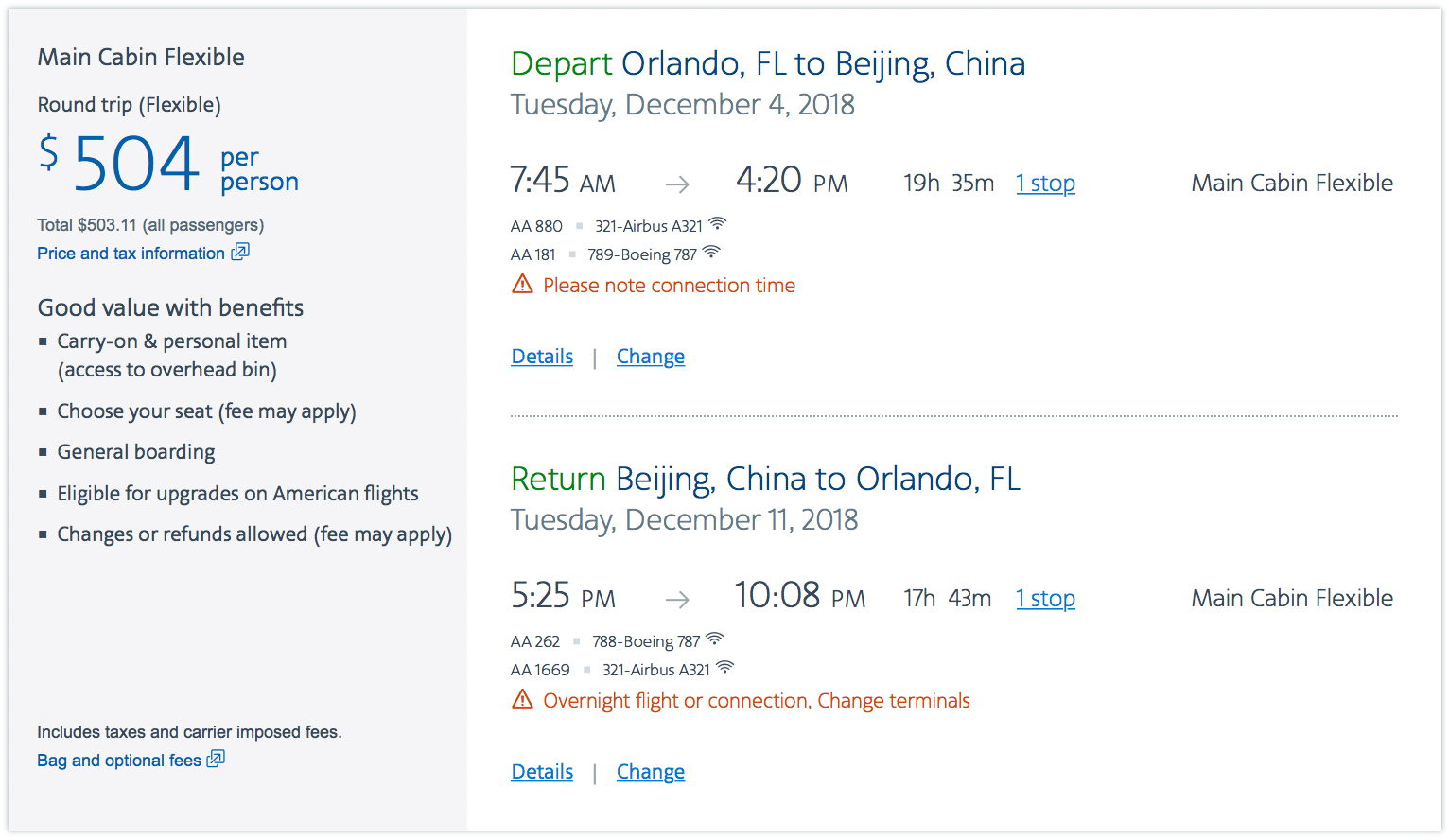 Orlando (MCO) to Beijing (PEK) in December for $504 round-trip on American: